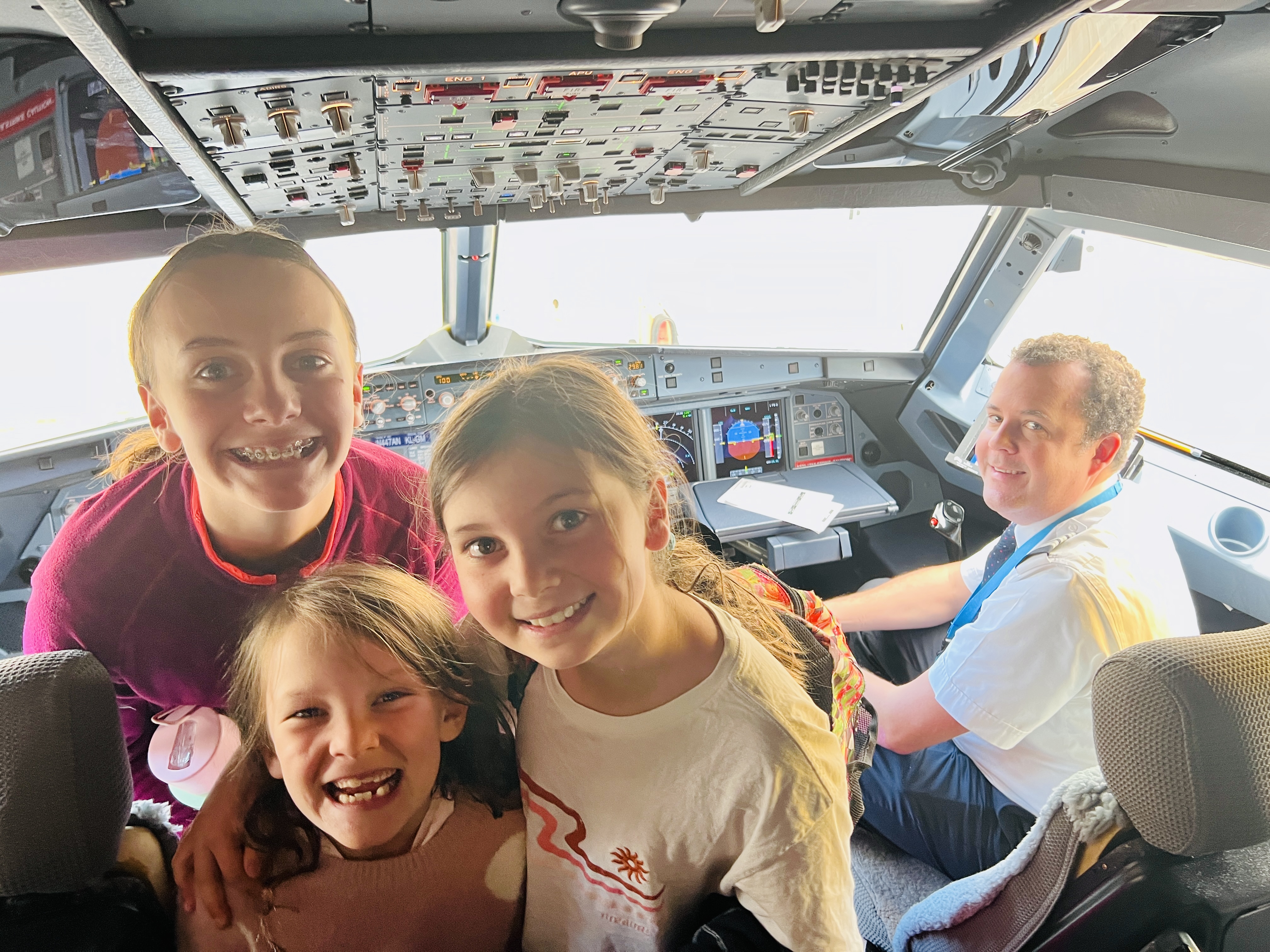 We were shocked when the flight attendant checked us in at the gate with a big smile and cracked jokes at us and the other passengers. As we boarded our brand new Airbus, we were ushered aside by another stewardess, who asked if the girls would like a photo in the cockpit.