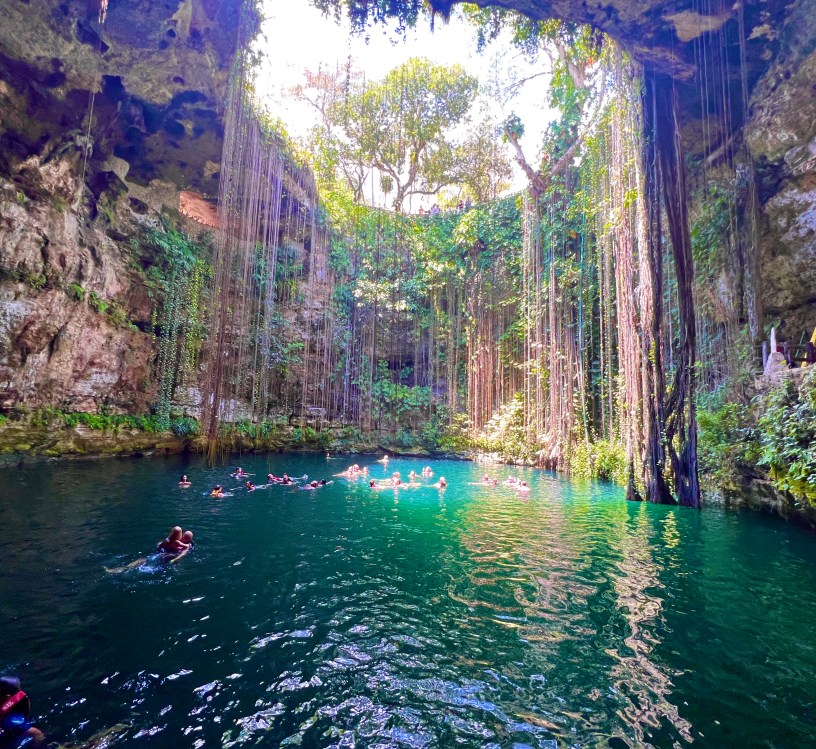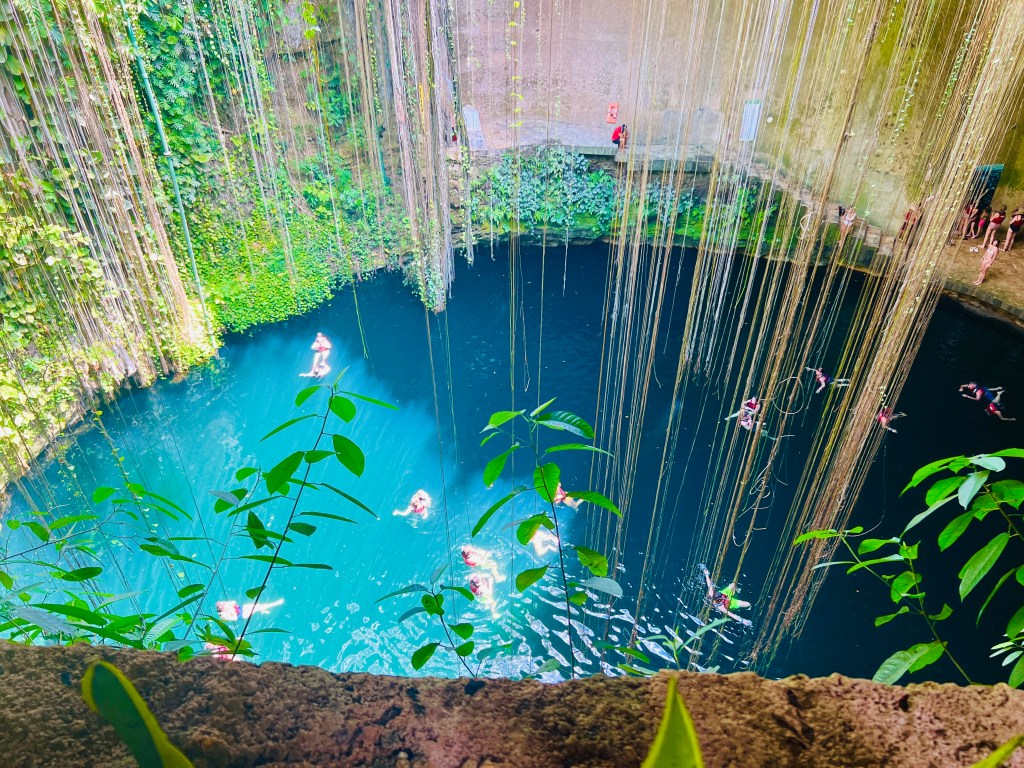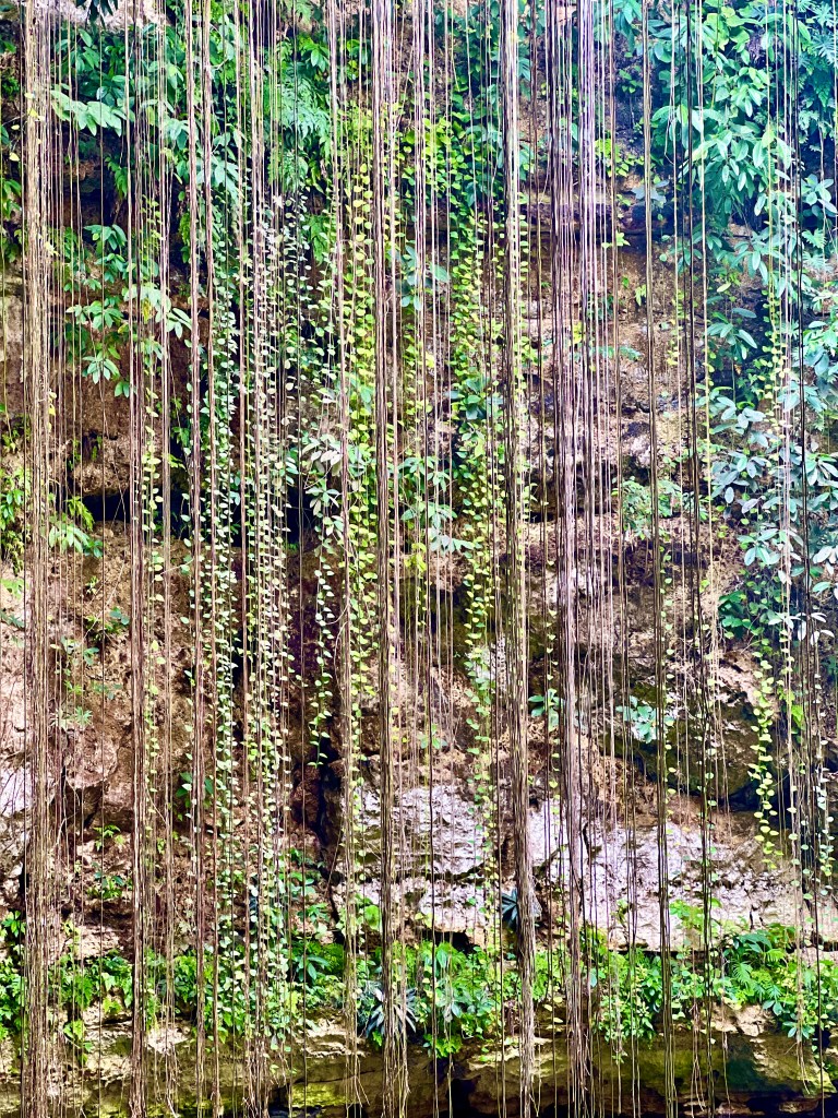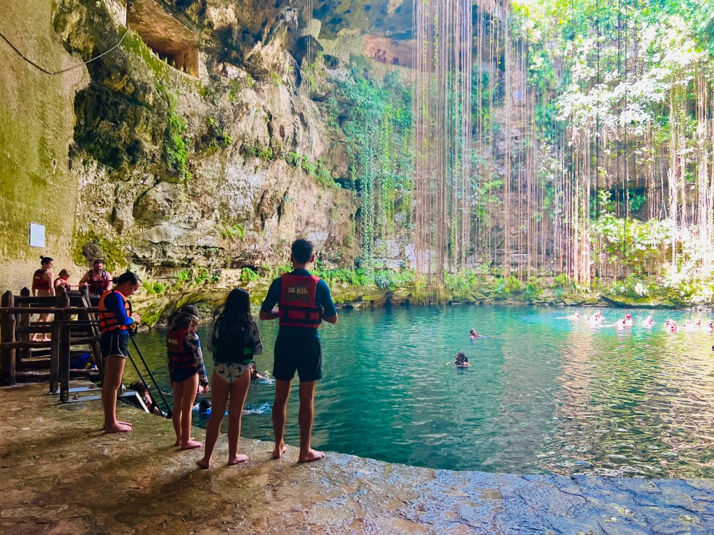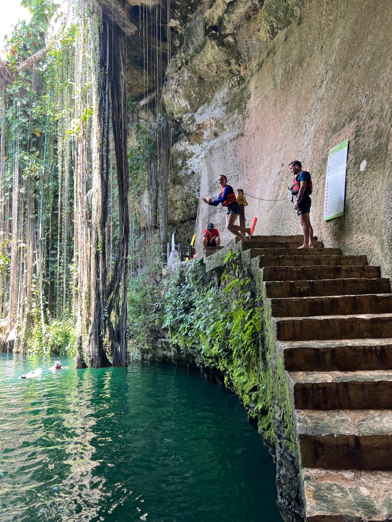 Finally we made our way down some stairs to a below ground viewing platform of the cenote. Vines covered the sheer limestone walls and the sun streaming in and glistening off the crystal clear water below.