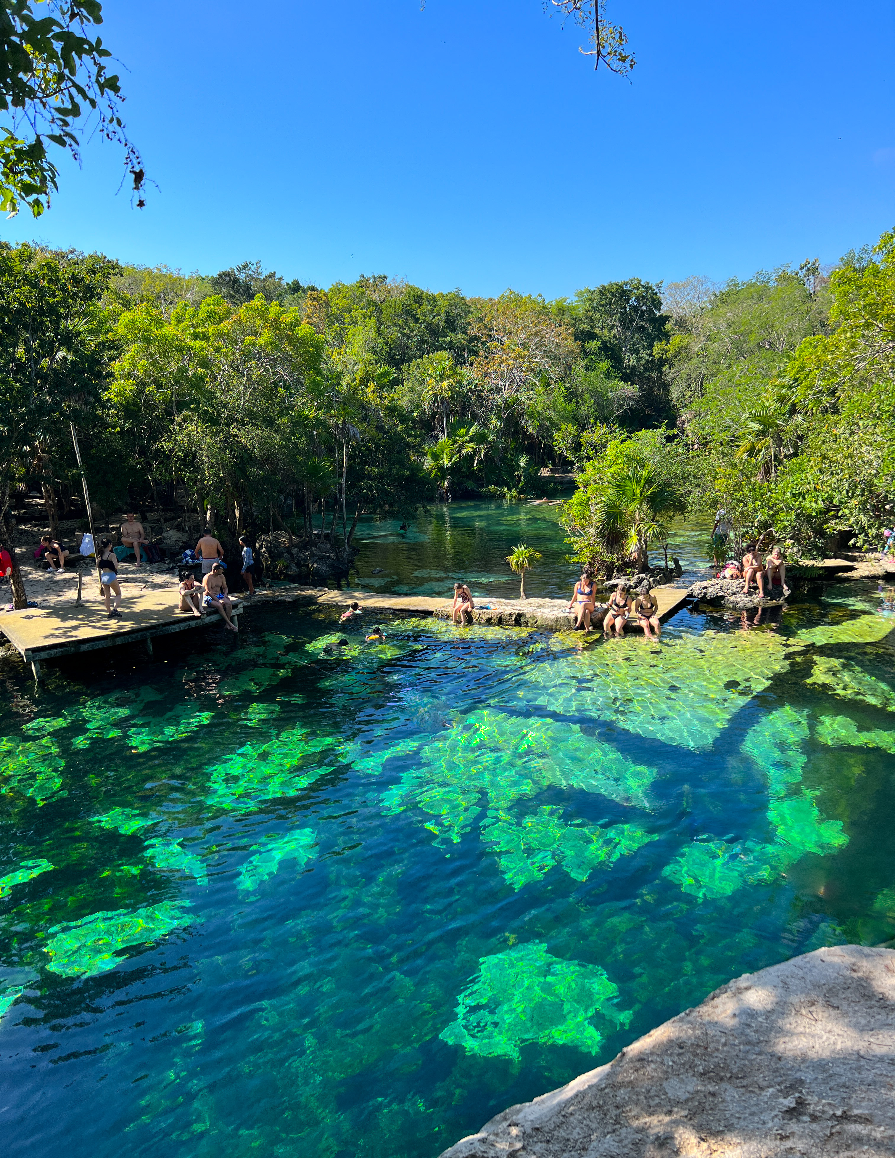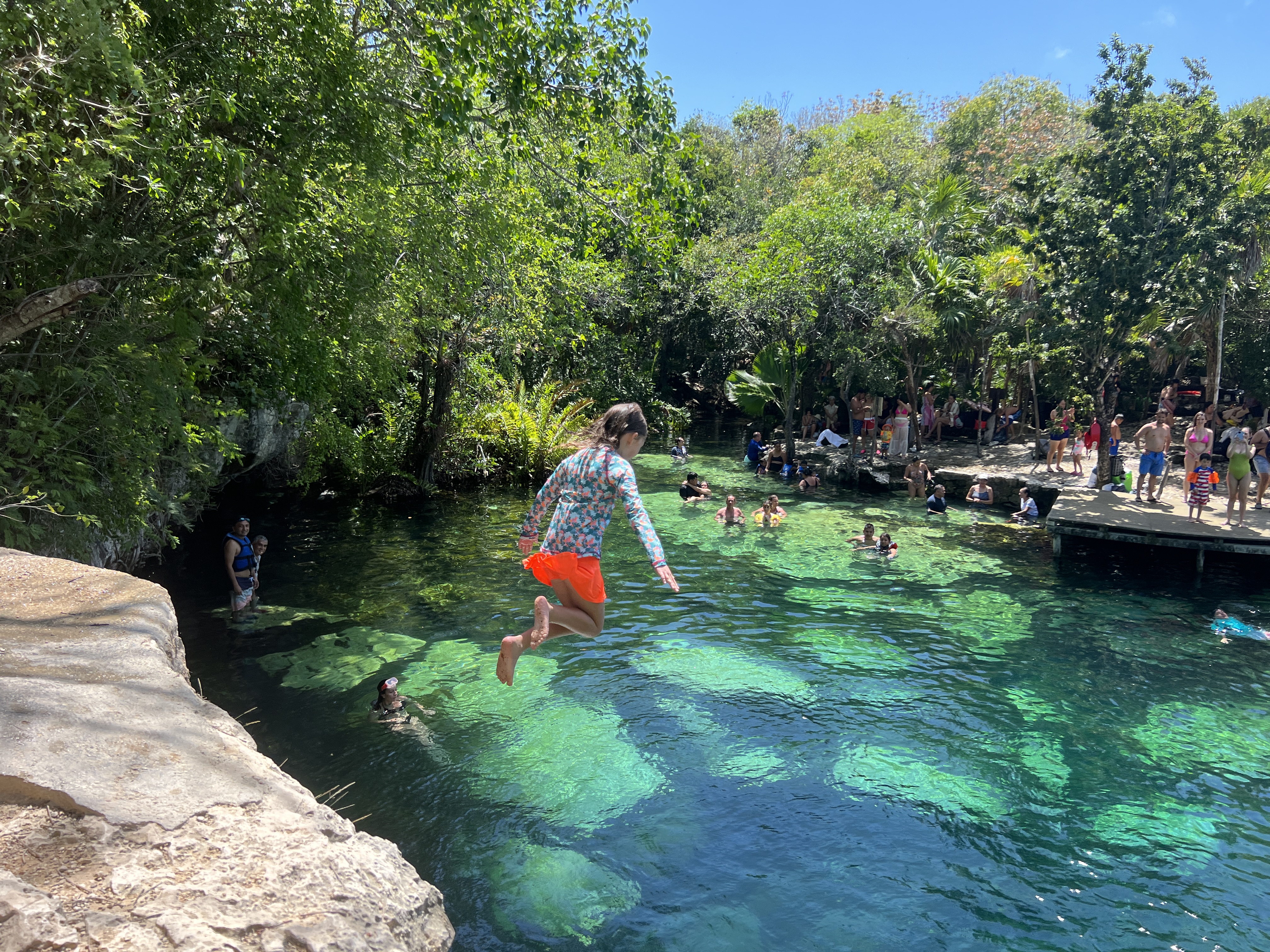 First stop was Cenote Azul, close to Playa del Carmen. This is a large, open air cenote set in a lovely jungle setting, with a reputation for getting very busy – but it was pretty quiet when we arrived. There are a number of discrete pools and caves to be explored, as well as a couple of fun jumping off points. We spent the morning snorkelling around the different pools and underground caves and jumping off everything we could.