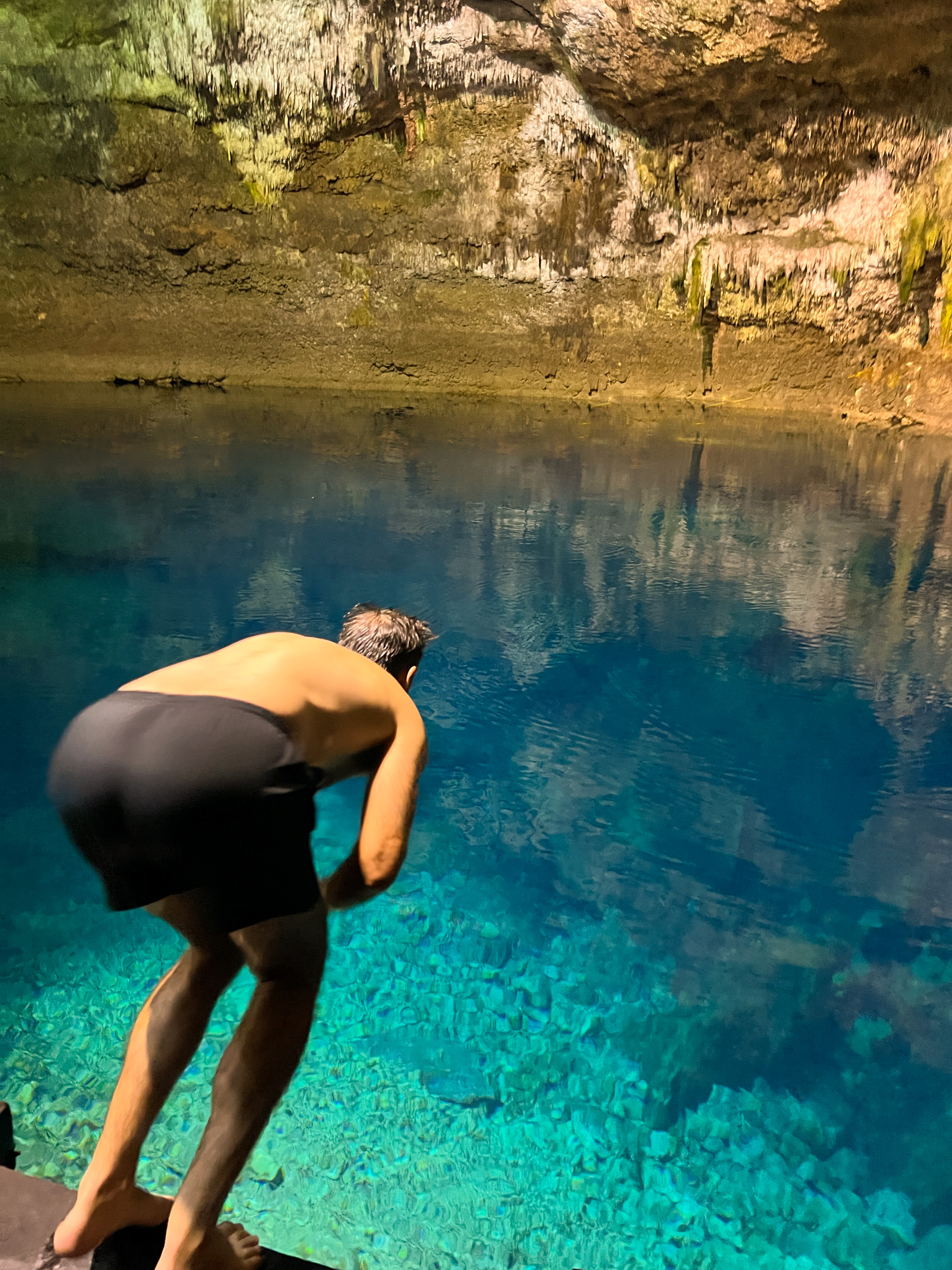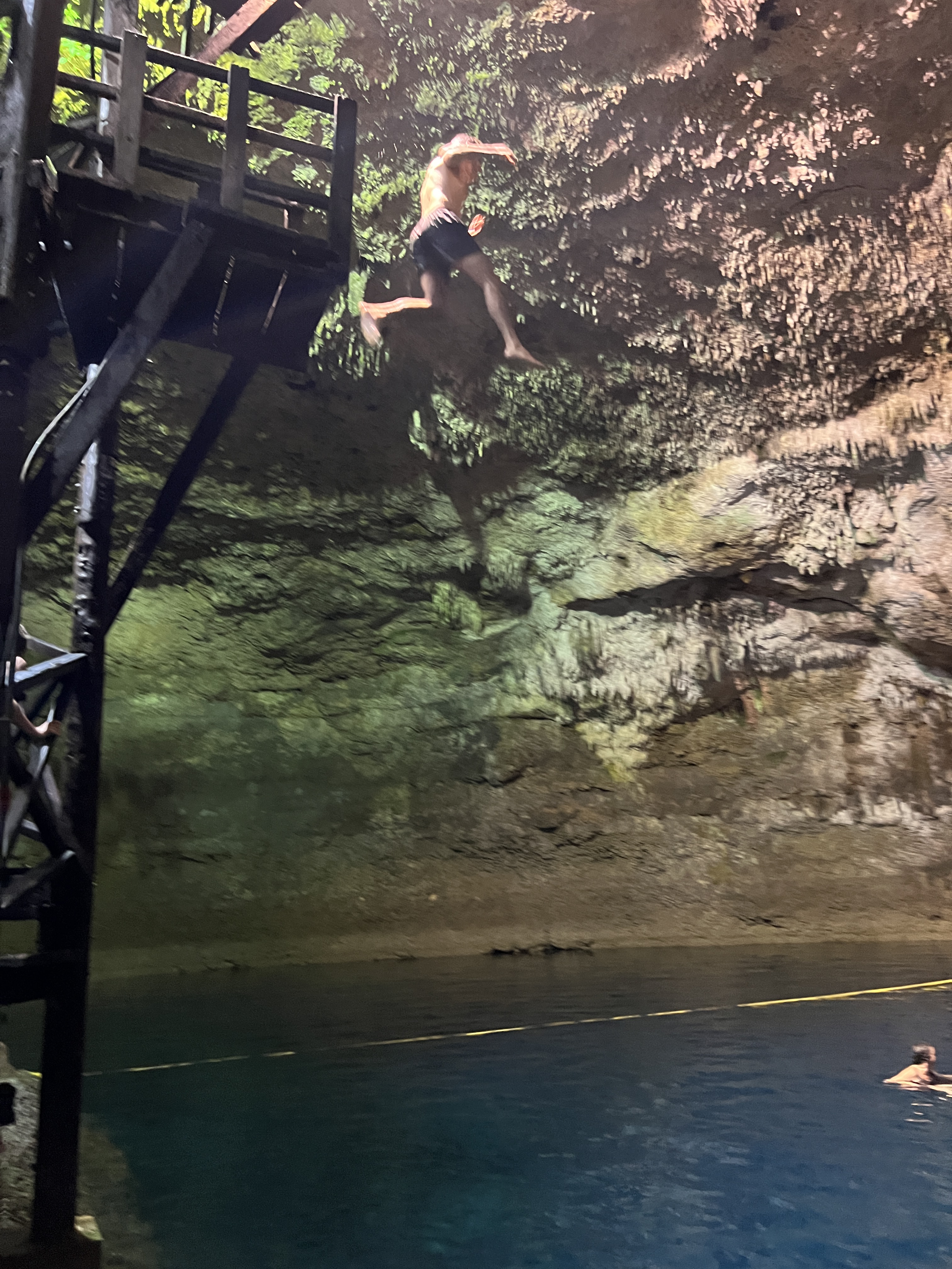 Our last stop for the morning was a beautiful underground cenote called Tankach Ha. This cenote was completely concealed in a cave with deep, crystal clear water and several diving platforms. We spent our time snorkelling in the water and jumping off the platforms into the water below.