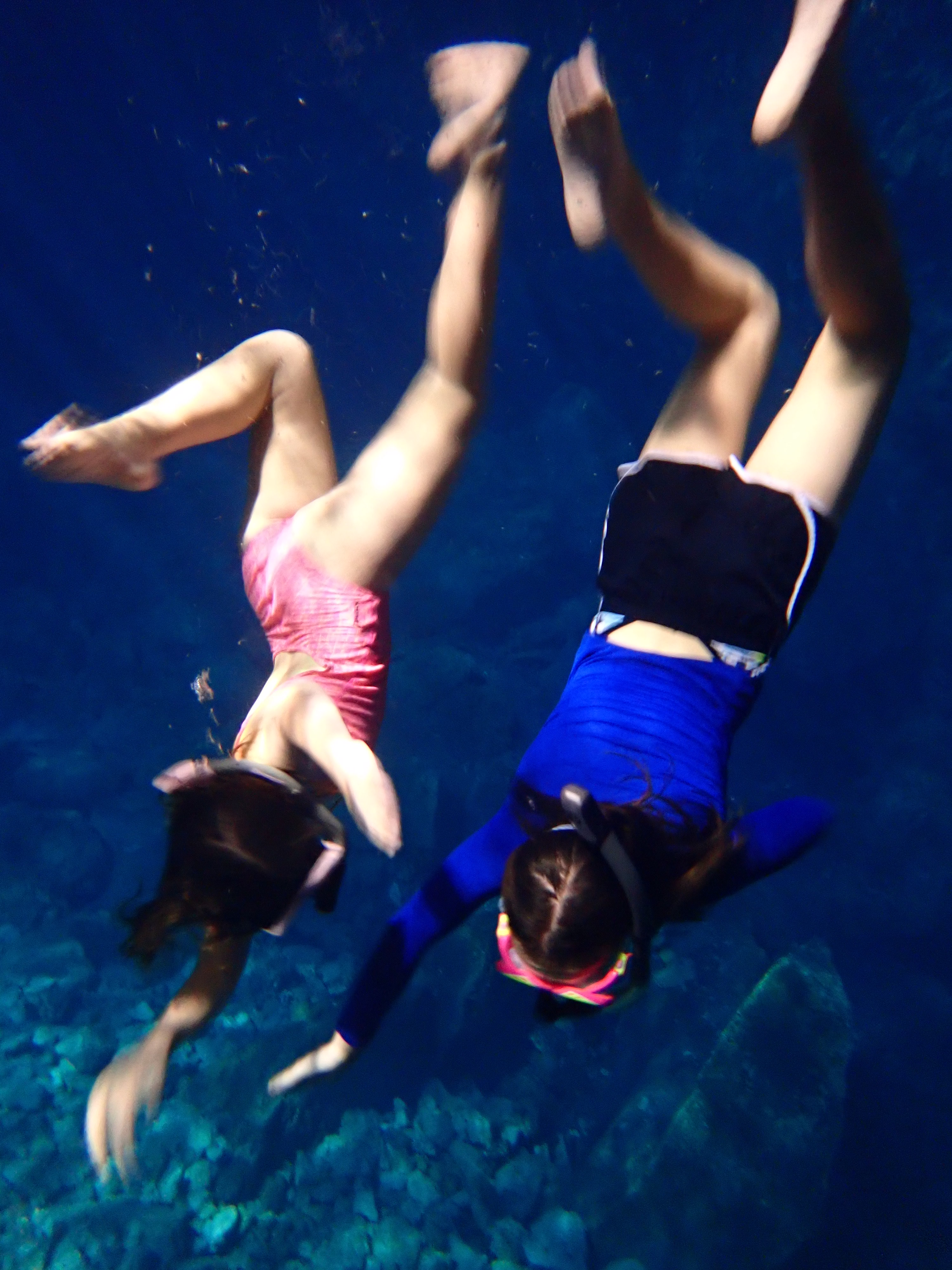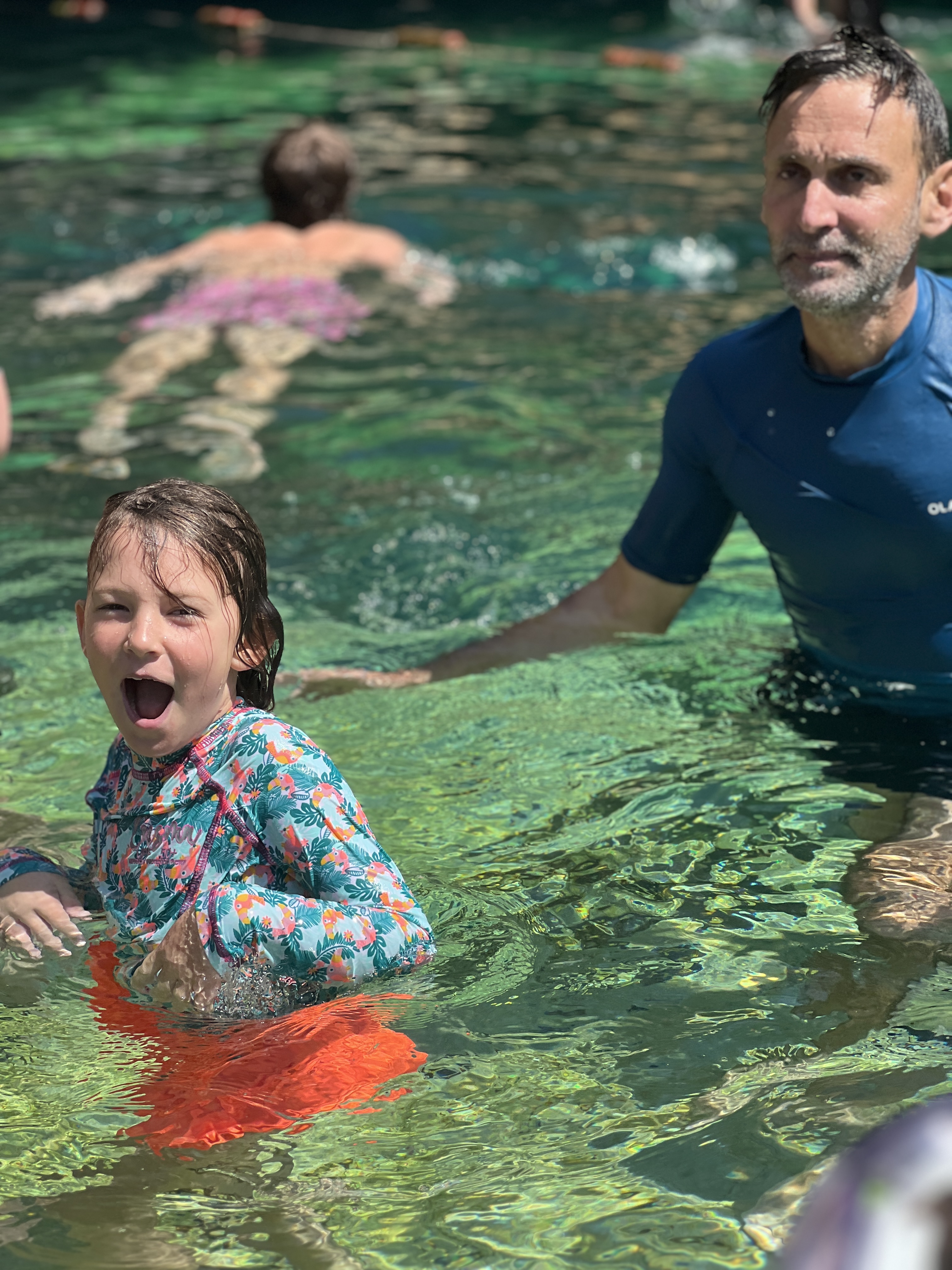 The roof of the first cenote, Cenote Samula, had partly collapsed, leaving half the water in sparkling sunshine, with the rest concealed under it’s limestone roof. It had the obligatory crystal clear, coolish water and a myriad of small and medium sized fish. The smallest ones seemed to enjoy nibbling on the toes of tourists, much to the amusement of our girls, who were more content to sit on the ledge and get a free, natural pedicure whilst I floated in the sun.