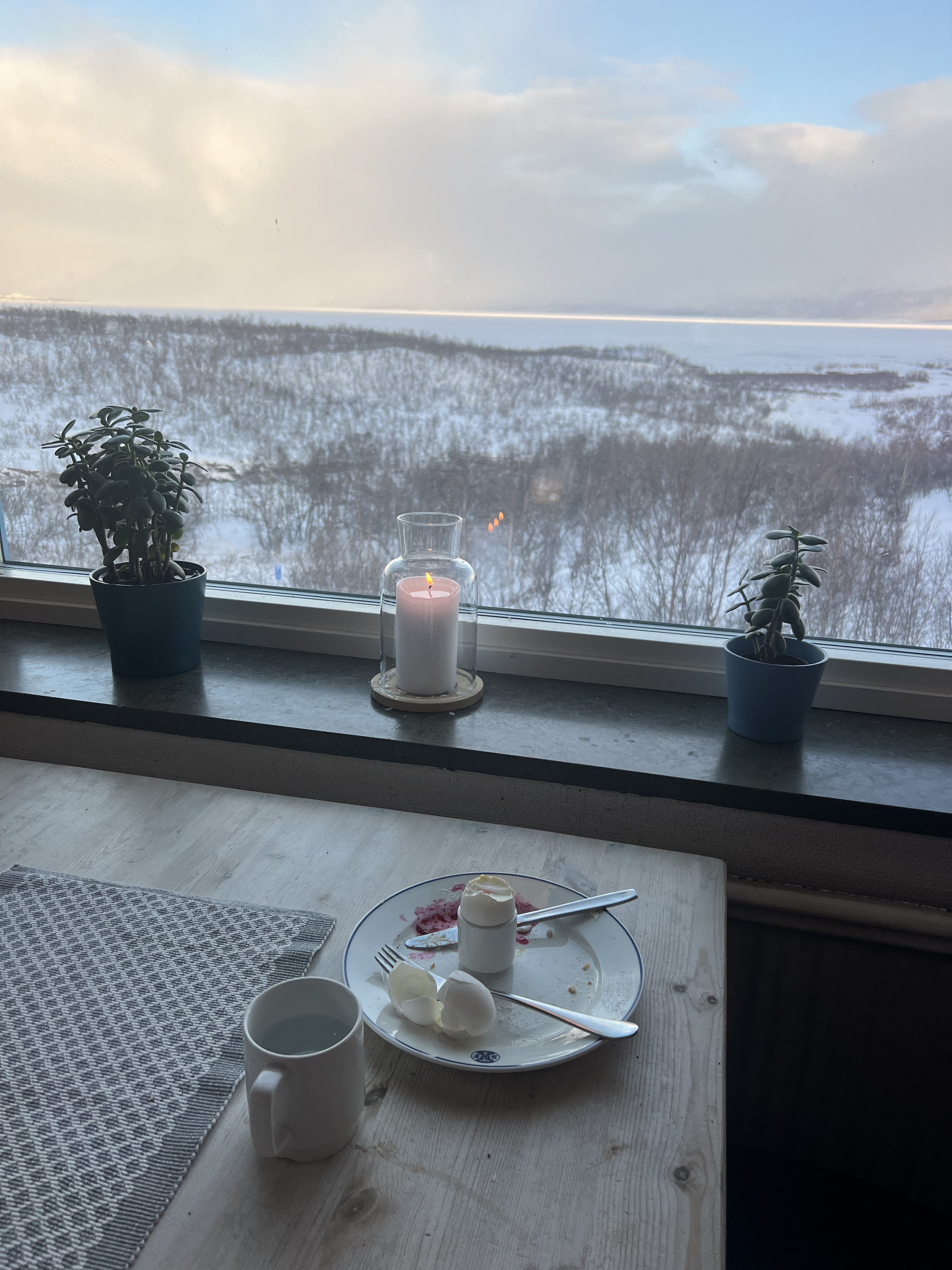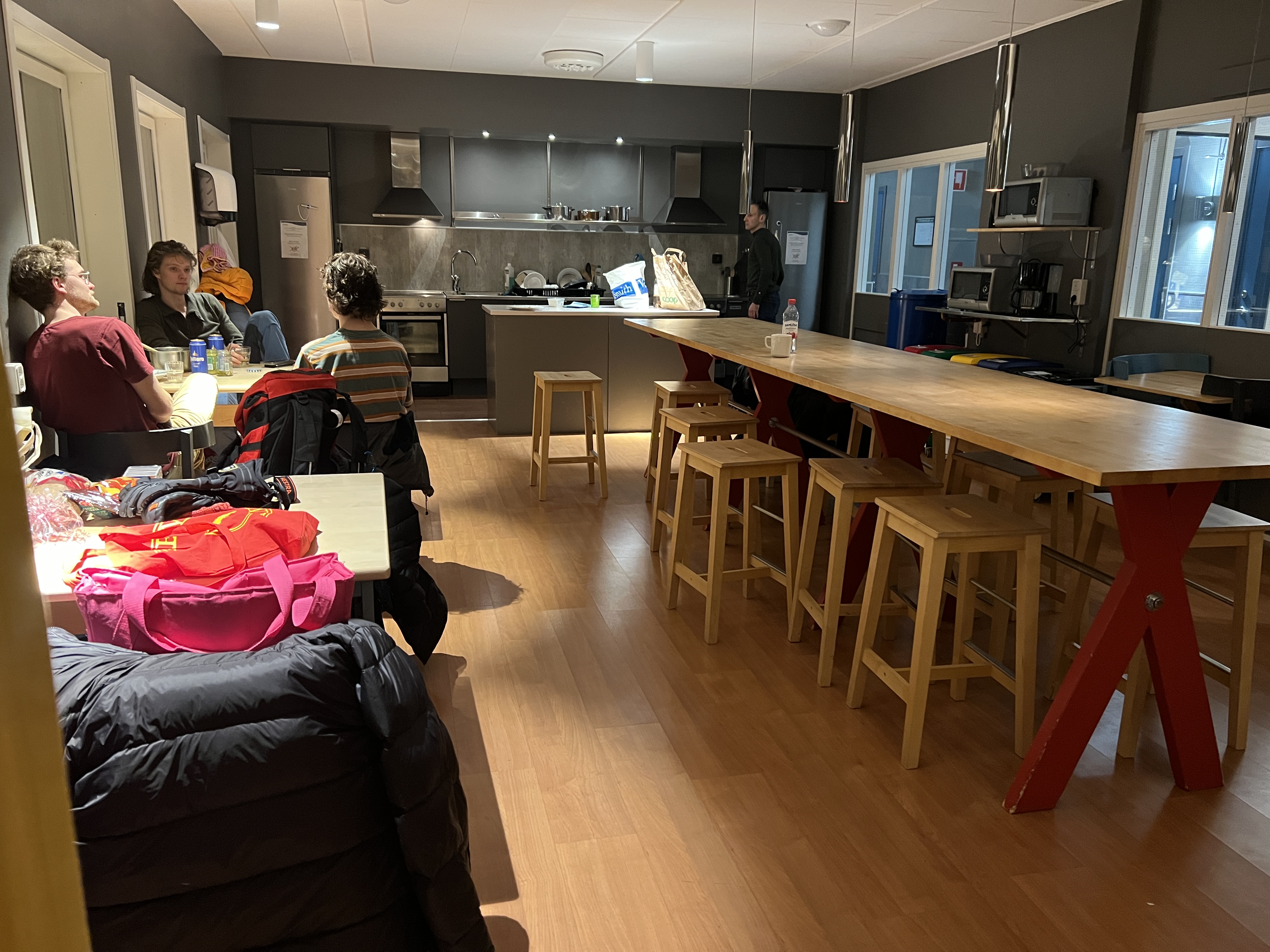 By the time we arrived at the Abisko Touristation (just over an hour from Kiruna and about 200kms north of the Arctic Circle) it was already dark. The Touristation was stunning – both inside and in terms of the views. The food also very good – a big high five all around. Our first night however we hit up the hostel kitchen for Anthony to cook up his famous smoked salmon salad and boiled sausage… the wine was amazing!