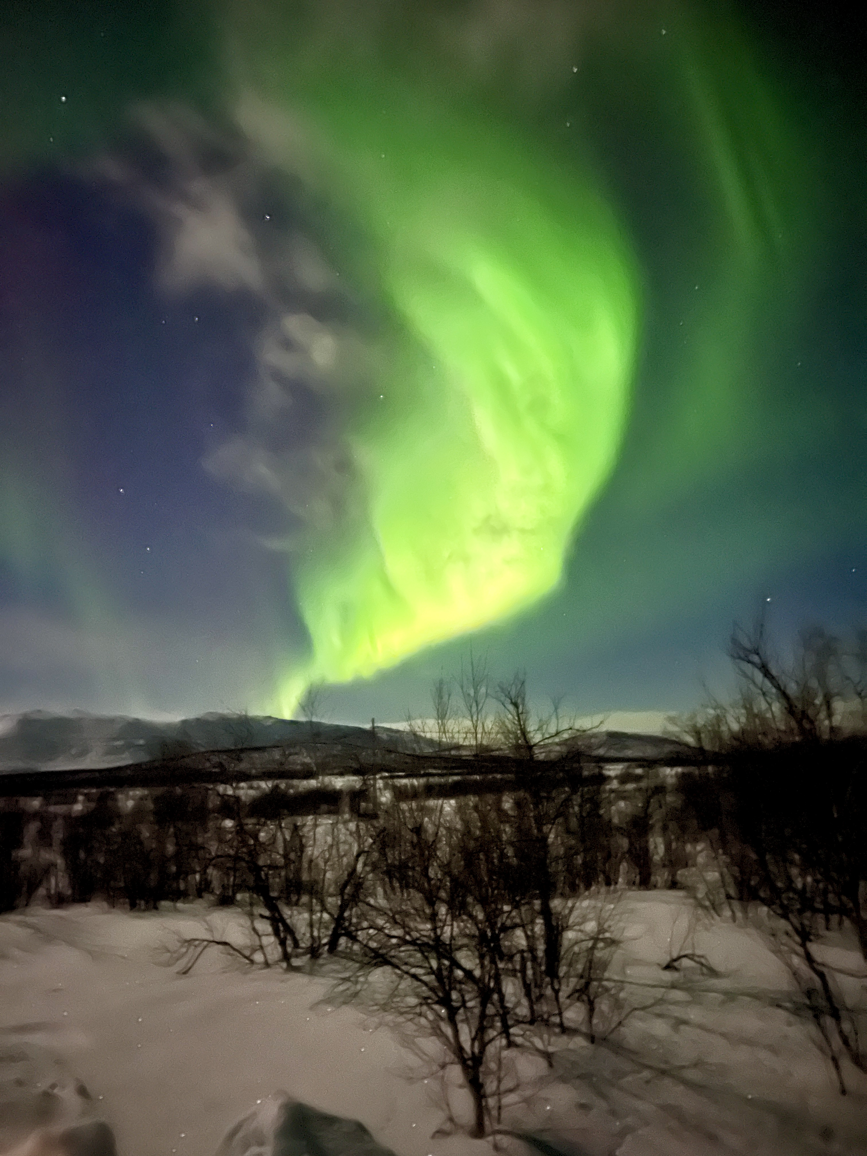 Sure enough, our vans turned south. We asked Jake what his strategy was for seeing the lights. Was it the speed of the solar wind? The strength of the KP index? The twitch of a reindeer’s tail? Some secret satellite imaginary only available to the Sami people? We needed to know his secret, because he boasted of an 80% success rate, and we would be chasing solo for the next few nights.