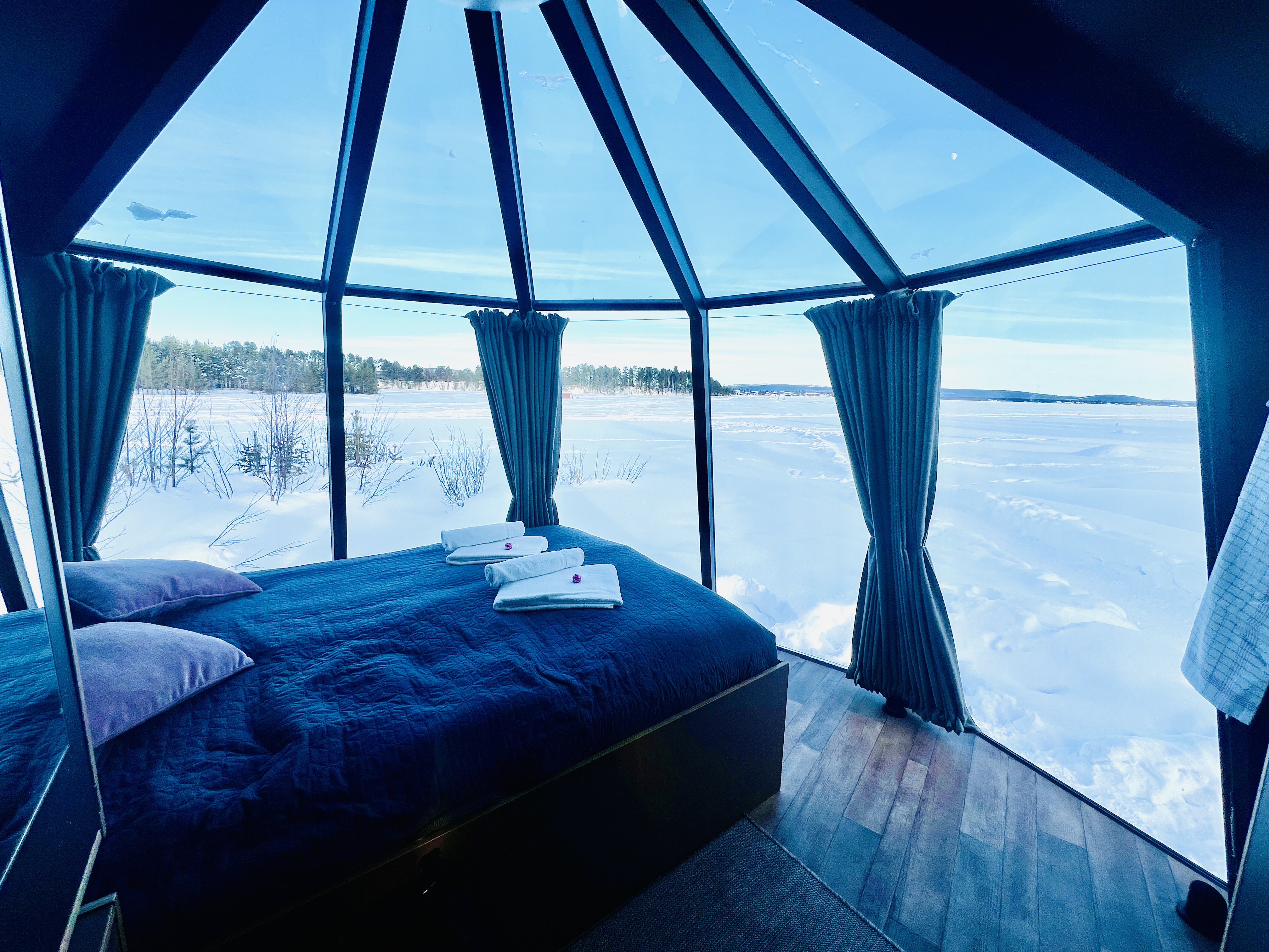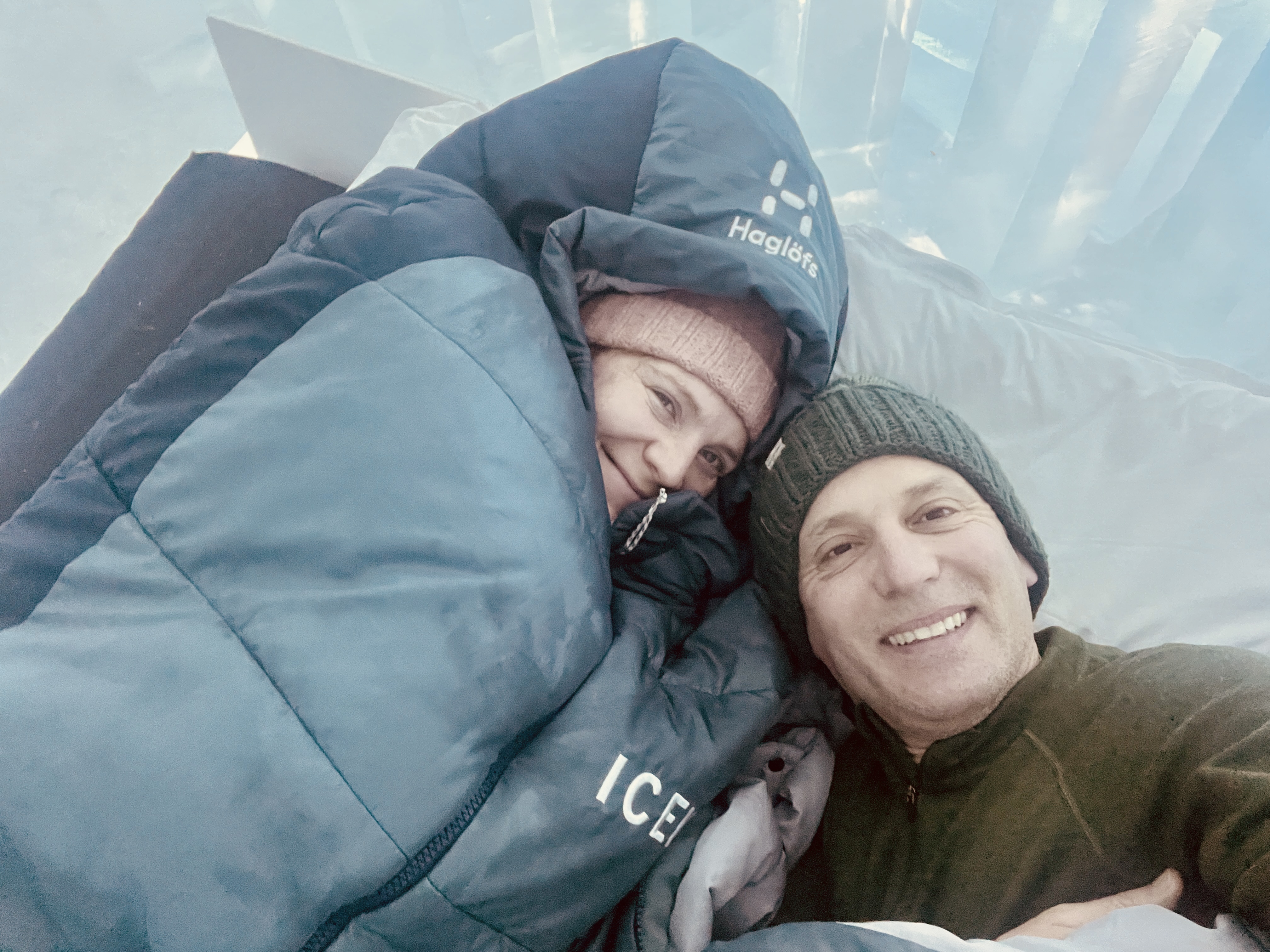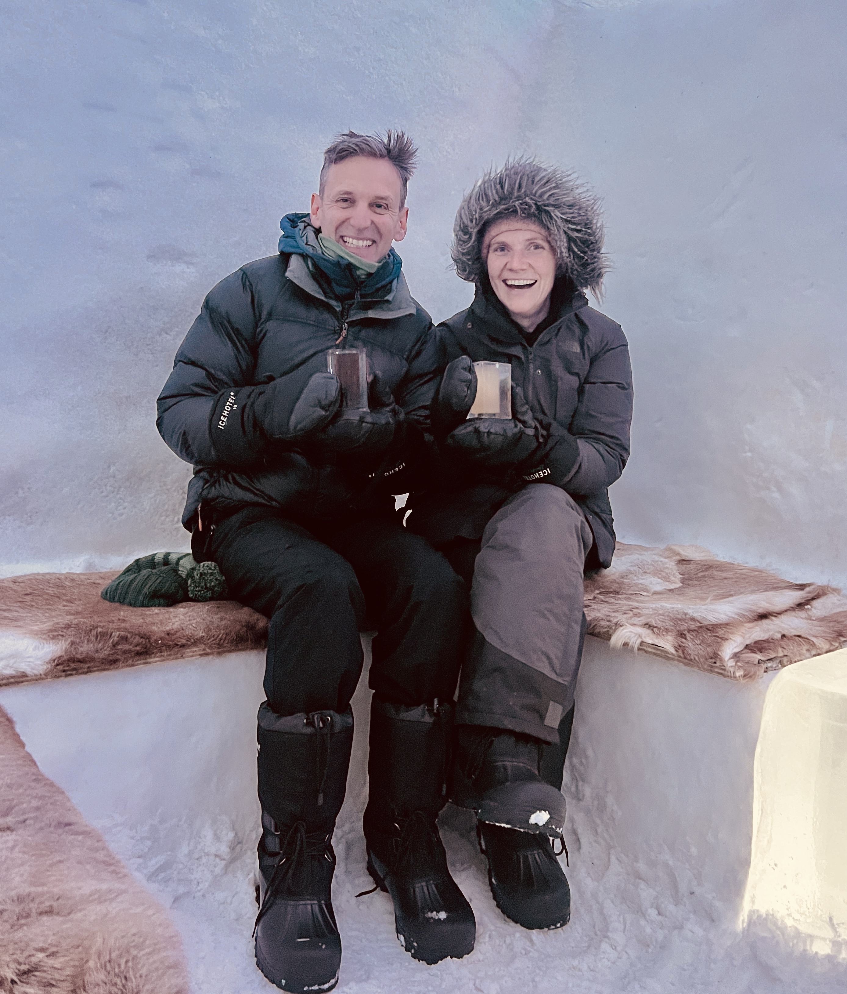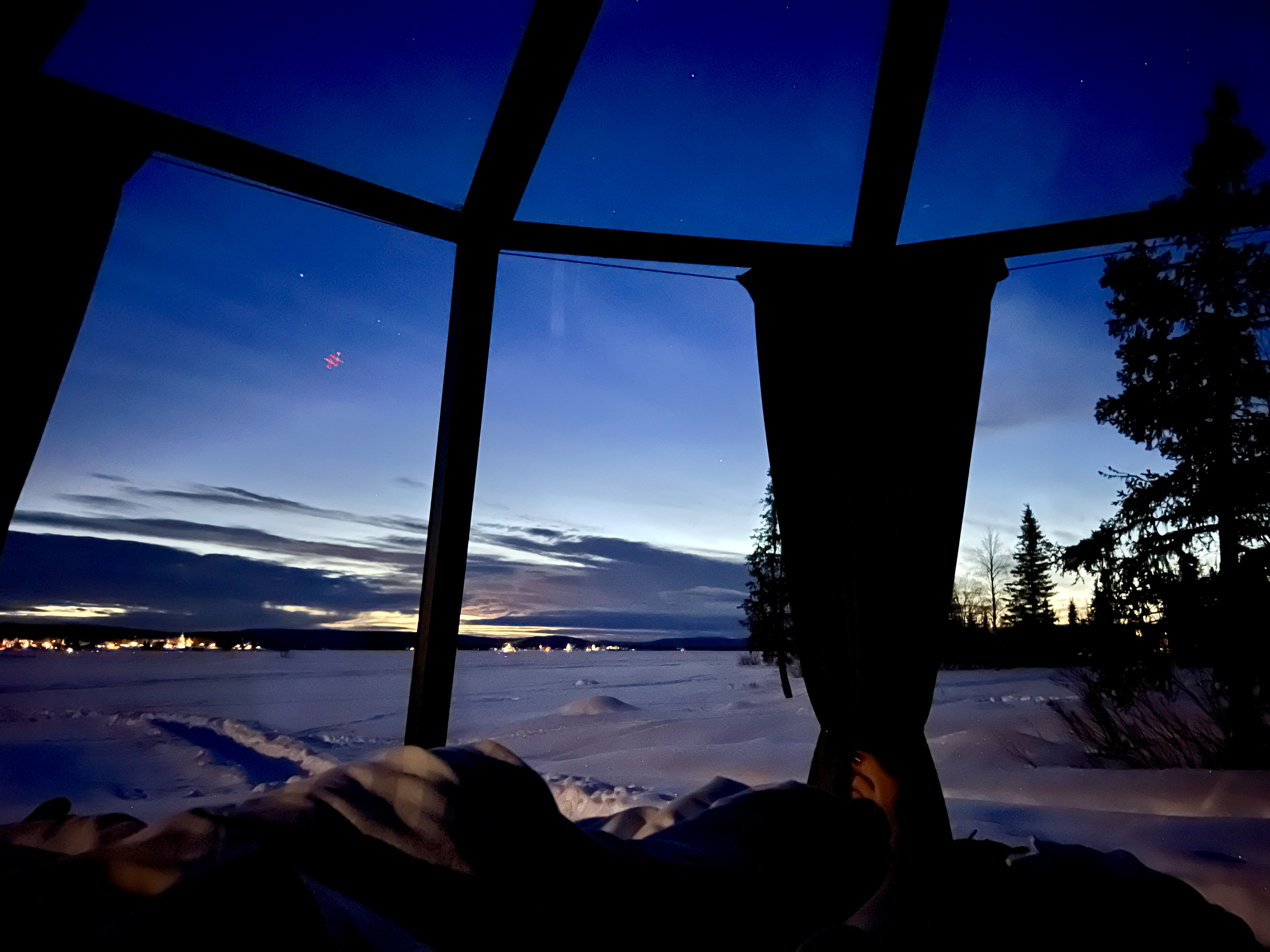 After Anthonys attempt at a run-trip-run-tumble-run in knee high snow (not sure his marathon training app envisaged artic conditions) we settled in for the night, propped up on pillows staring out our igloo window waiting for the brilliance. Alas we were not to be gifted this evening, clearly not enough clear sky we said to each other. But the view anyway was spectacular including the tourists peering in our window first thing in the morning.