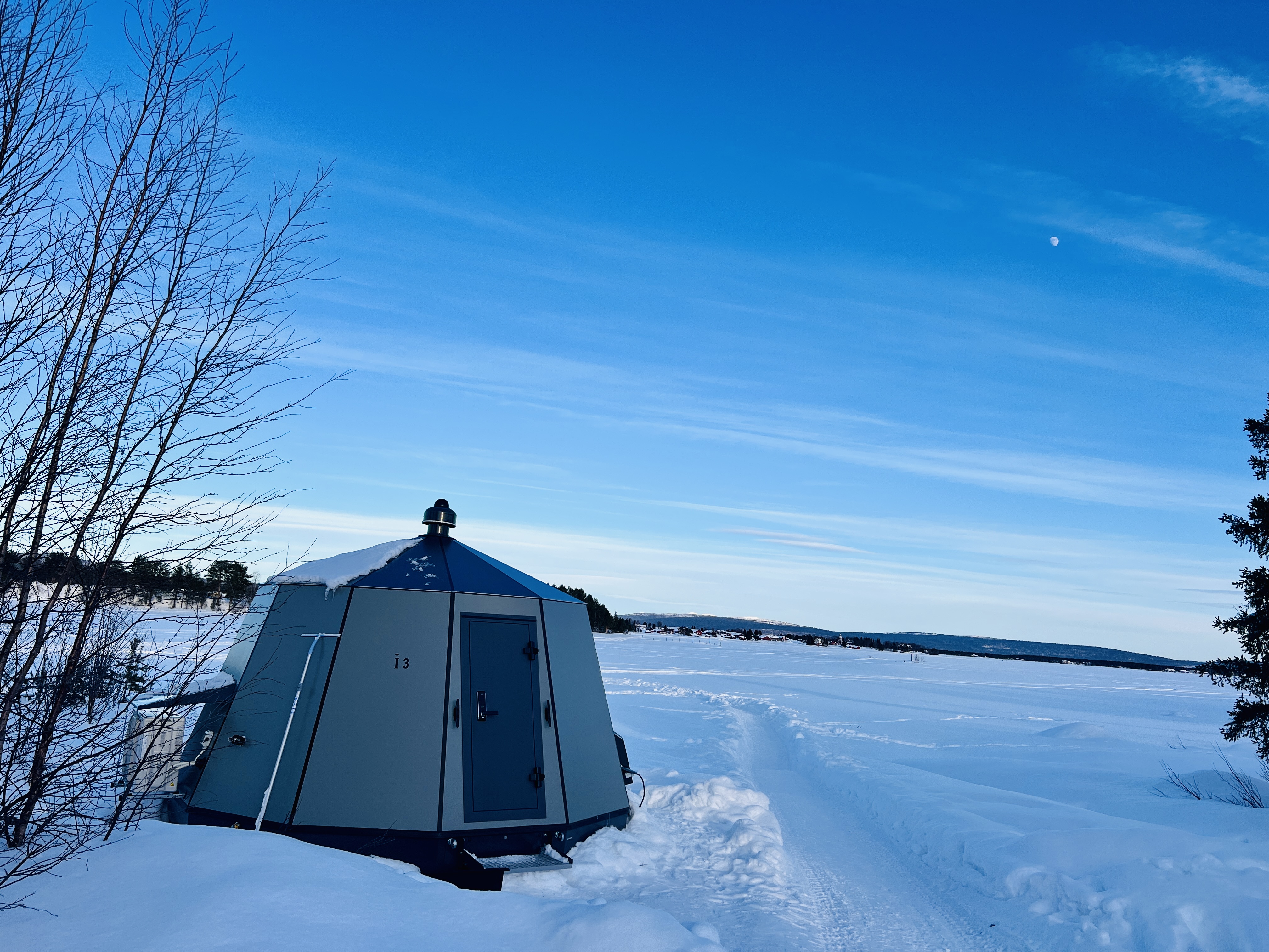 Our final night of this trip was in an igloo, on the other side of the Torne River. Hoping for another Jake-style light display we stocked the fridge (read: snow pile outside) with champagne.