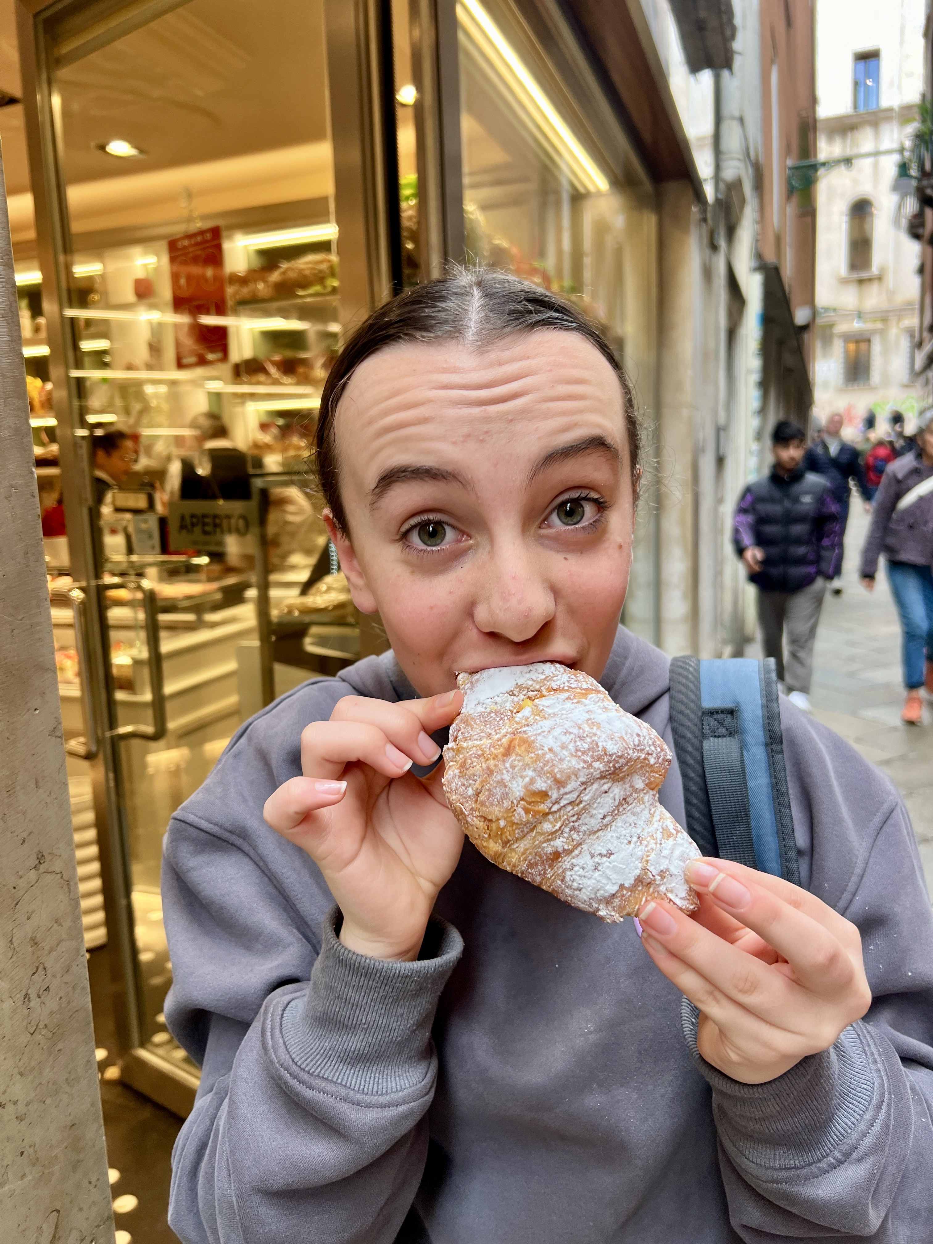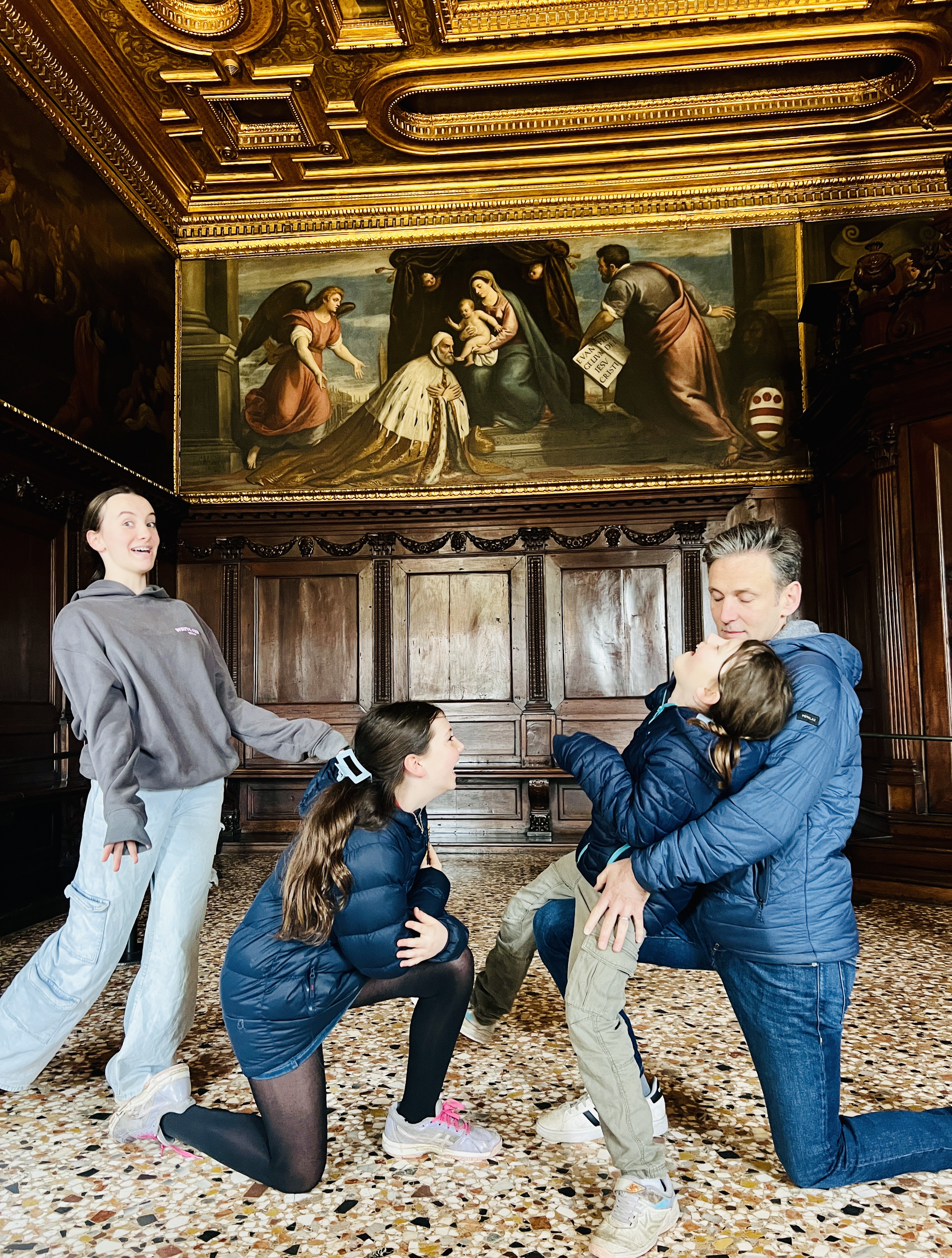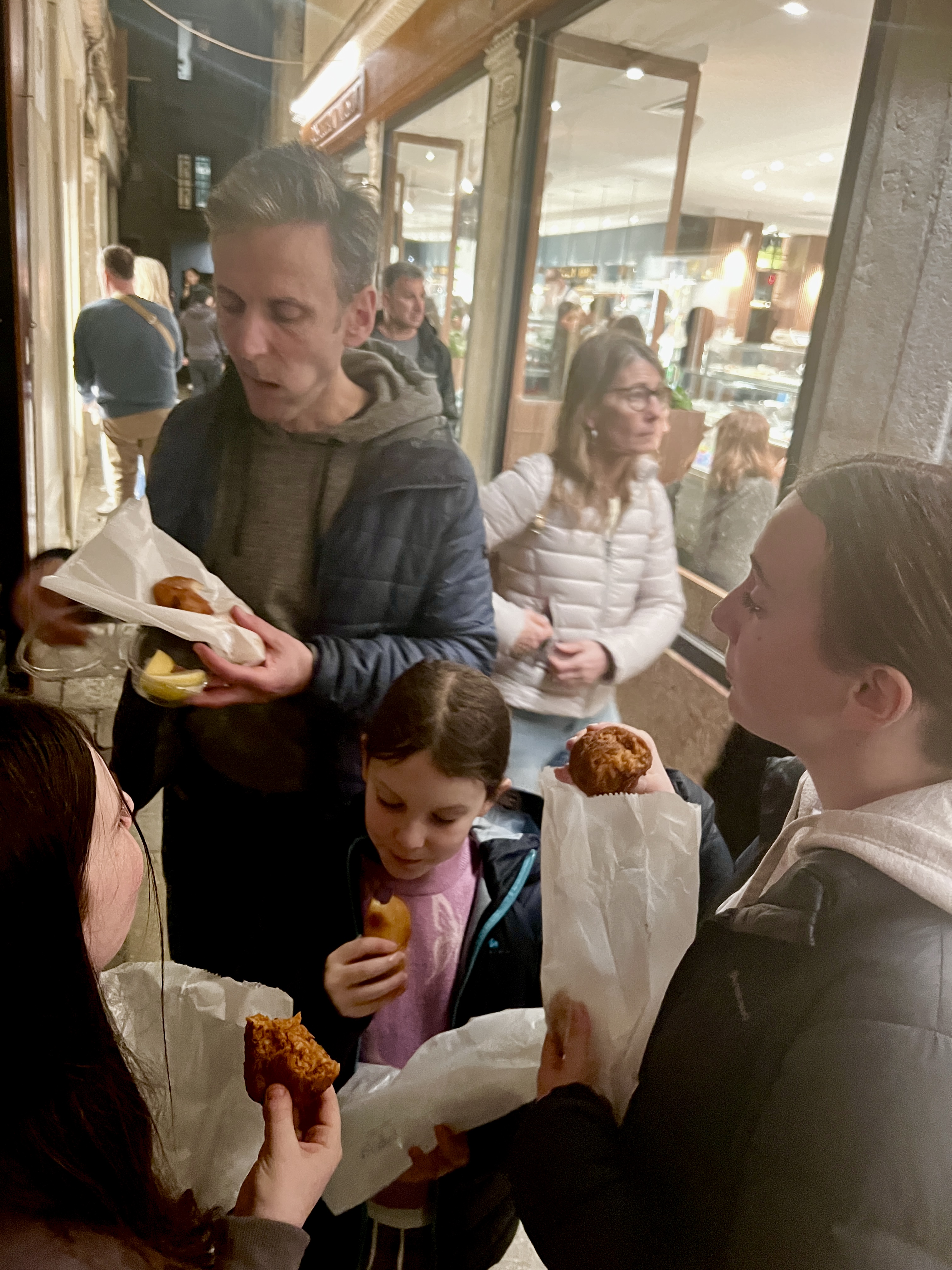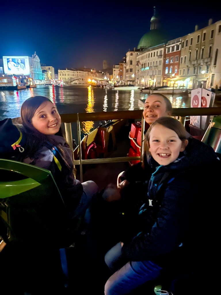 Watching the kids’ faces as we made our way by ferry along a very quiet Grand Canal at midnight to our apartment near the Rialto Bridge was worth the Ryanair flight. We hadn’t been to Venice for almost 30 years (even longer for Liz) but still remember something of its beauty and uniqueness. The kids were gobsmacked as we passed palace after church after palace of stunning, brightly lit and sometimes slightly crumbling buildings on our $100, 20 mins ferry ride (yes, not a taxi or gondola, this was the public ‘ferry’ at $20 a trip) – but again, worth the price of admission.