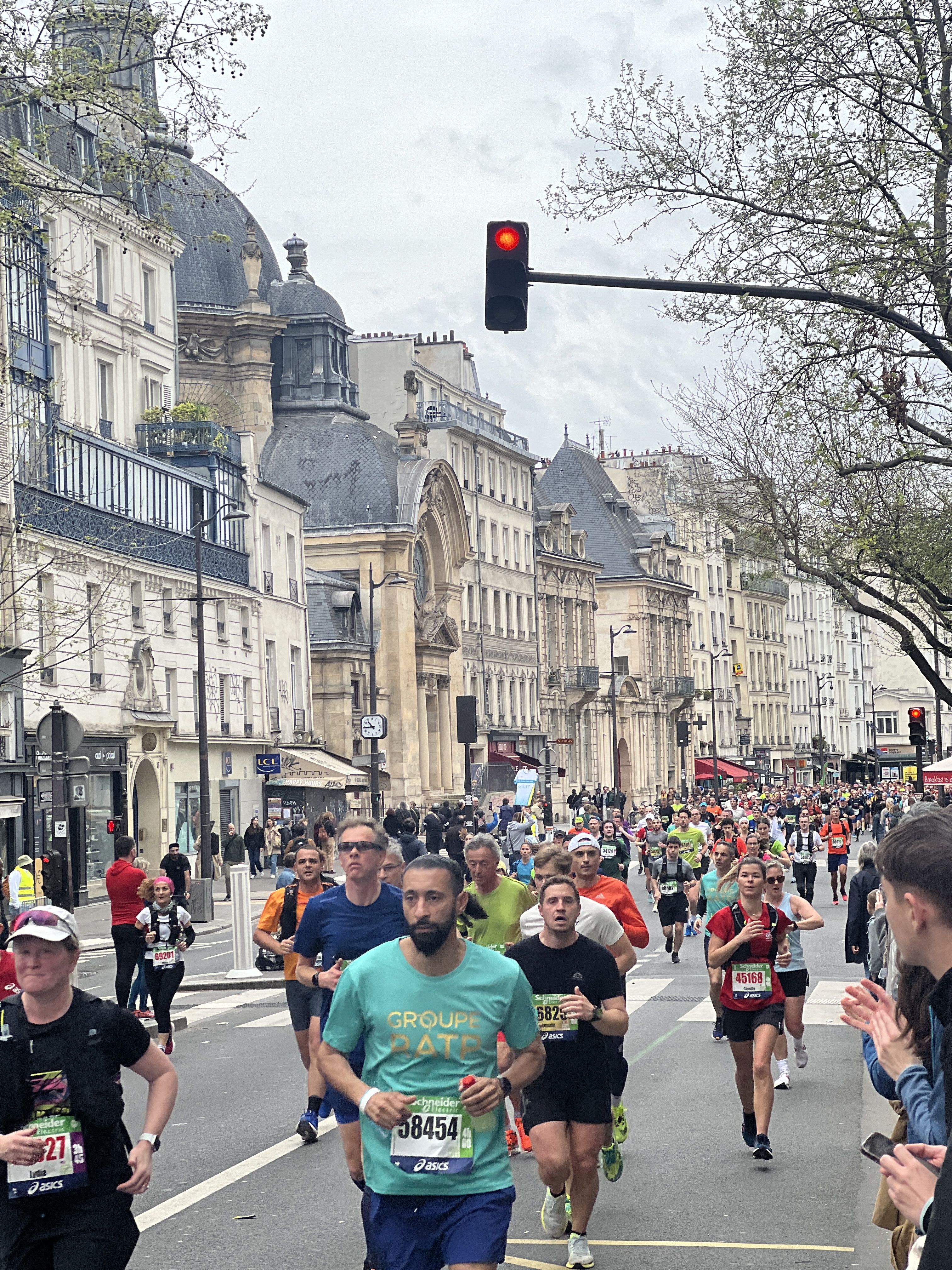 The metros heading towards the starting line at Arc de Triomphe were packed with runners and supporters – the start times were stagged over some 4 hours to let the runners get away without starting a stampede. In our pre trip planning, we had anticipated an Australian style 7am start, leaving us time for a nice long lunch and a leisurely trip back to London on a 5pm Eurostar. In actual fact Ant got away at 1030.