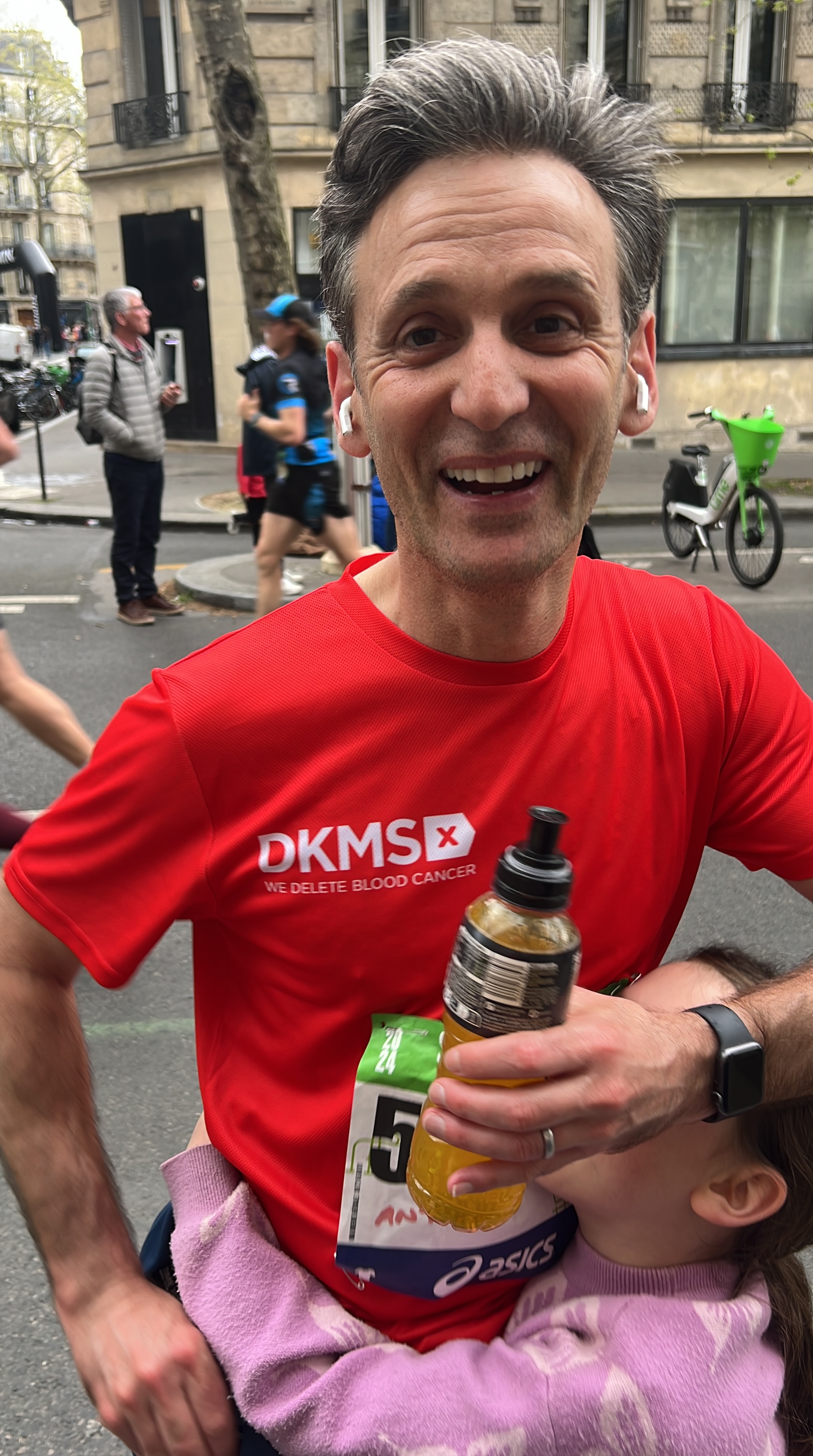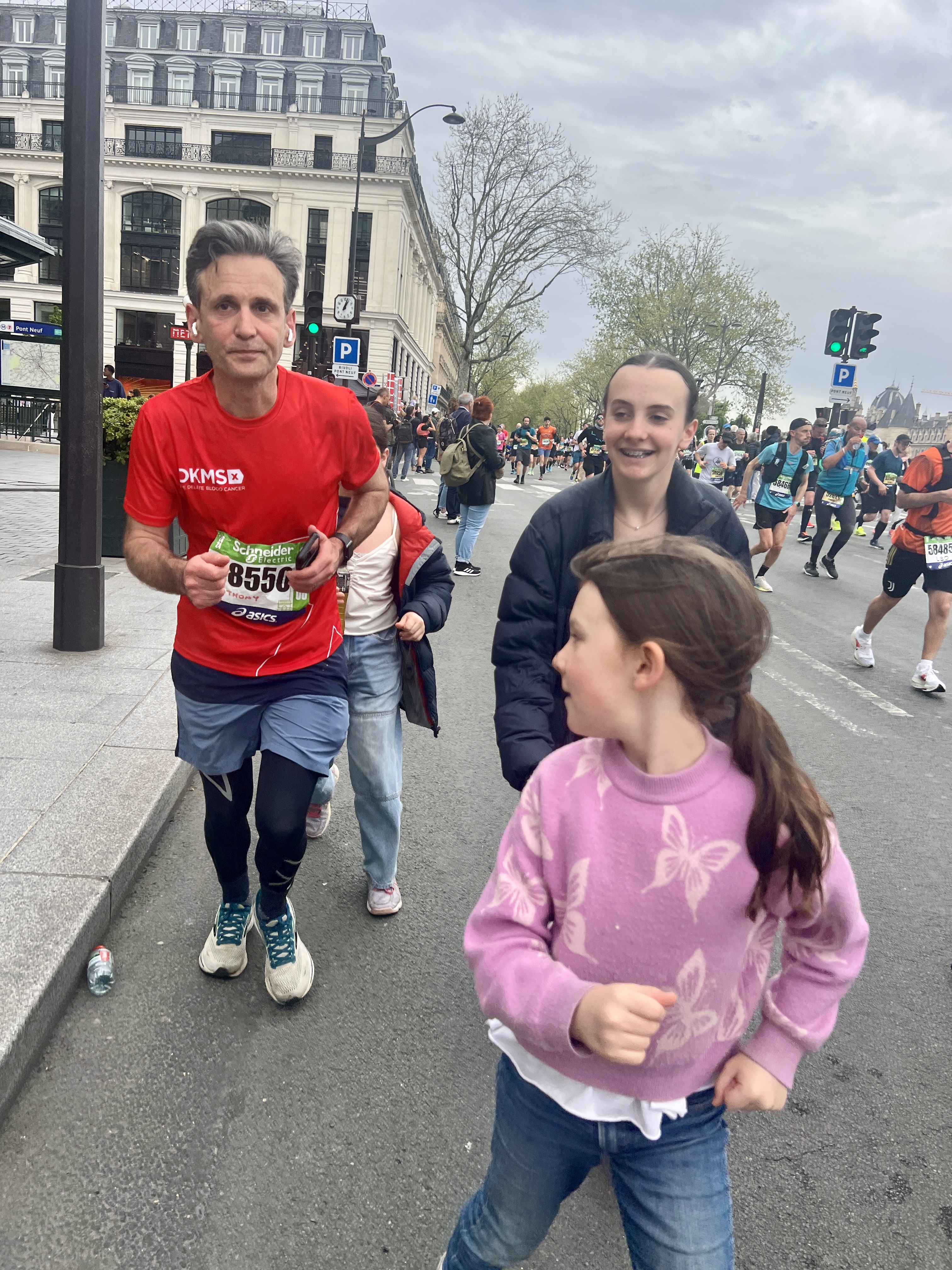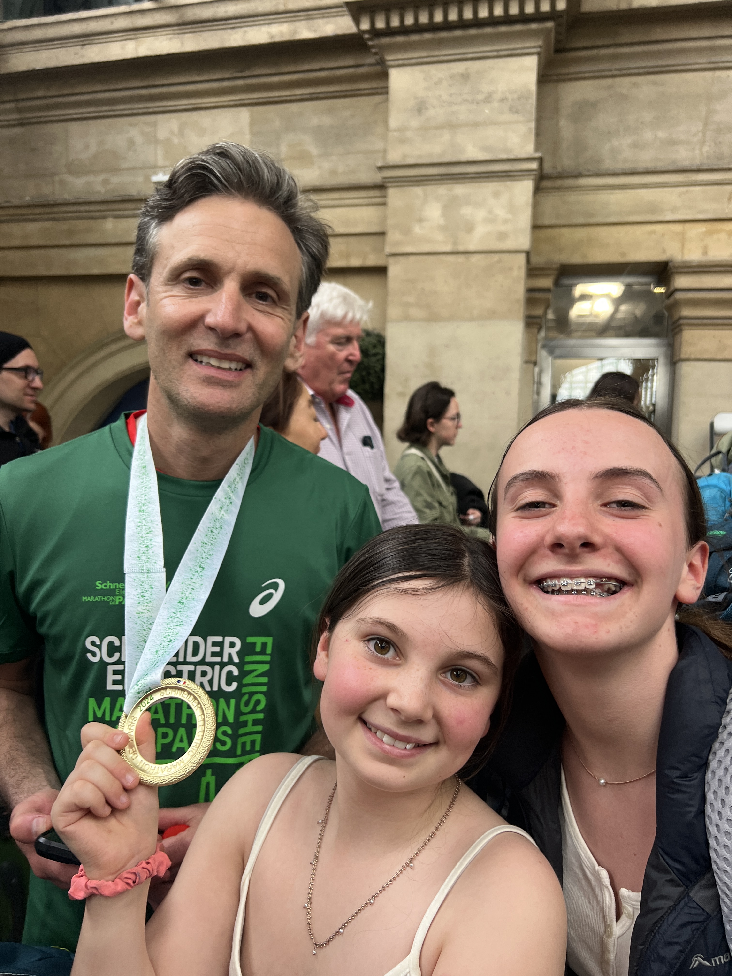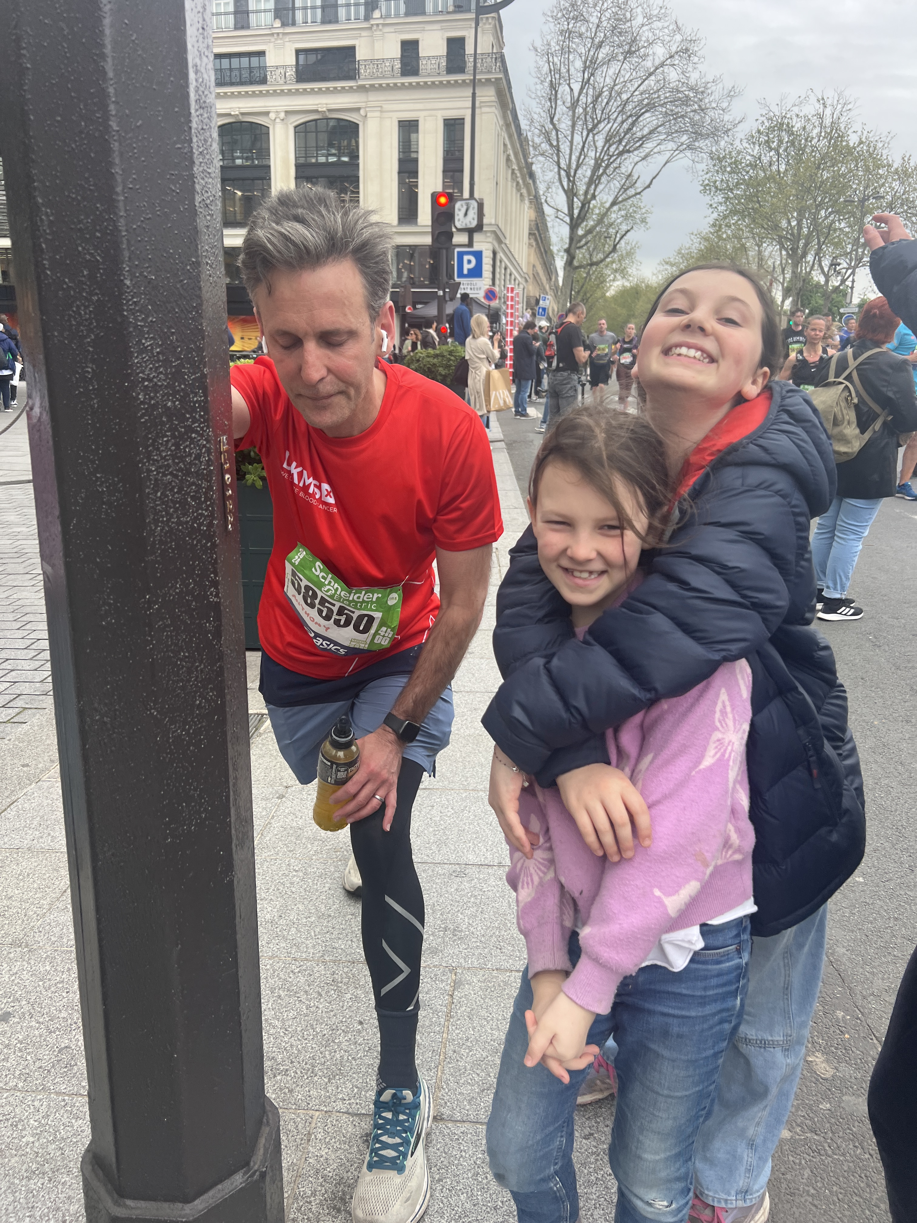 The run was spectacular. Thousands of supporters lined the tree lined boulevards as we made our way down the Champs Elysee, past the Place de la Concorde, around the Opera, the Louvre and up towards the Bastille. Ant took it relatively easy (keeping half an eye on the planned mountaineering trip to Mont Blanc in July) but was on track for a reasonable time at the halfway mark coming out of the Chateau to Vincennes. Liz and the girls were there at Bastille to cheer him on.