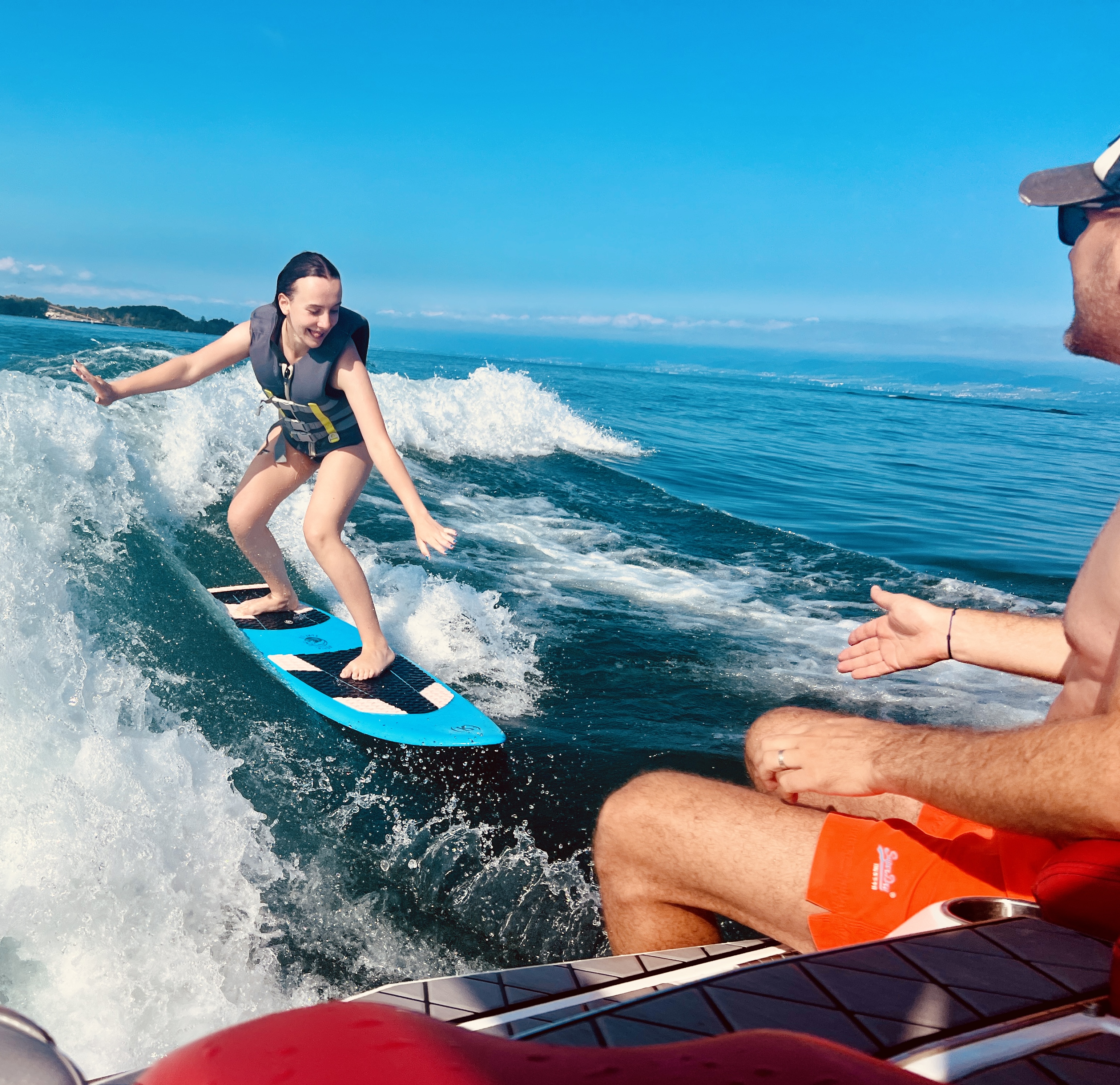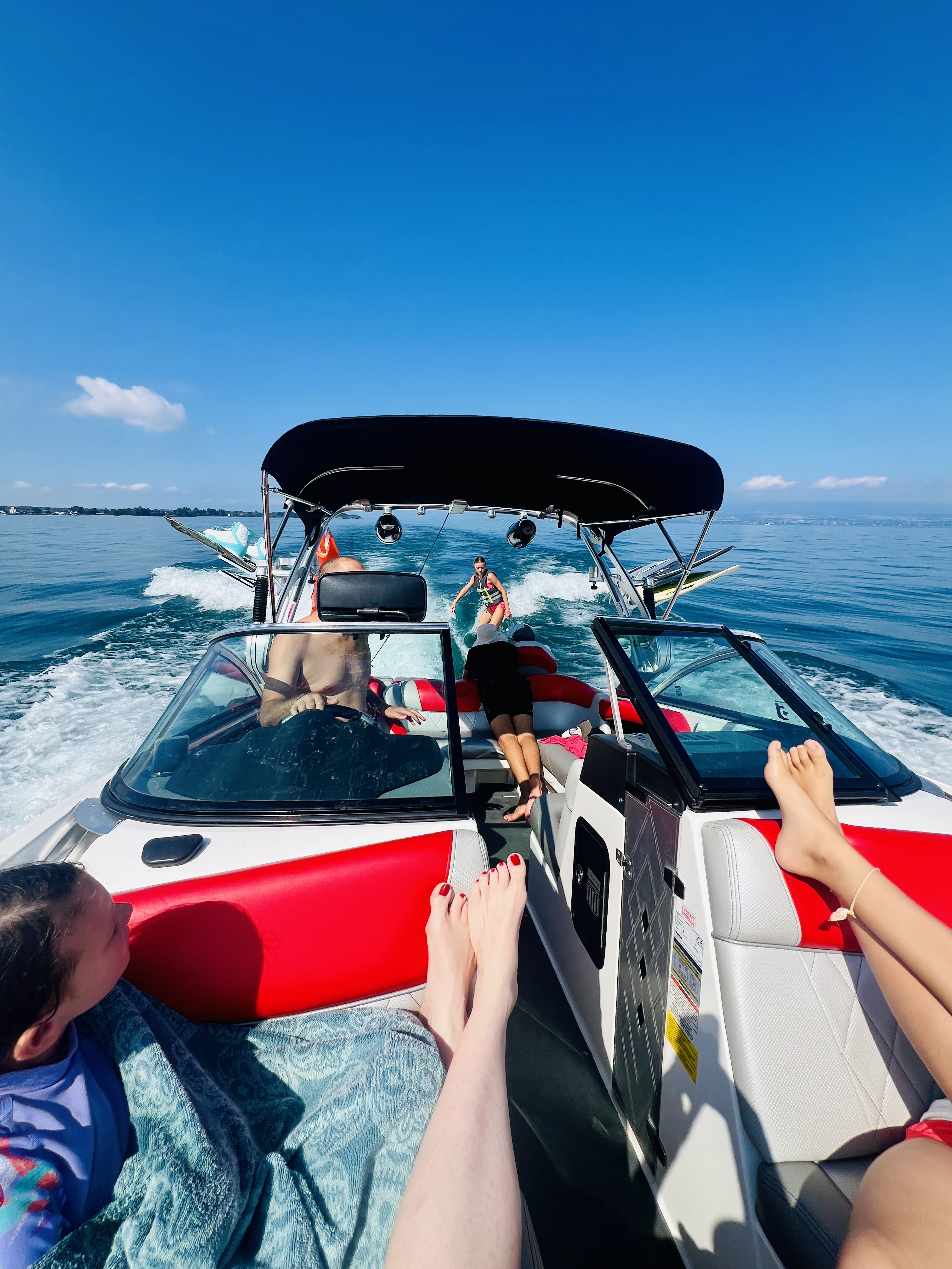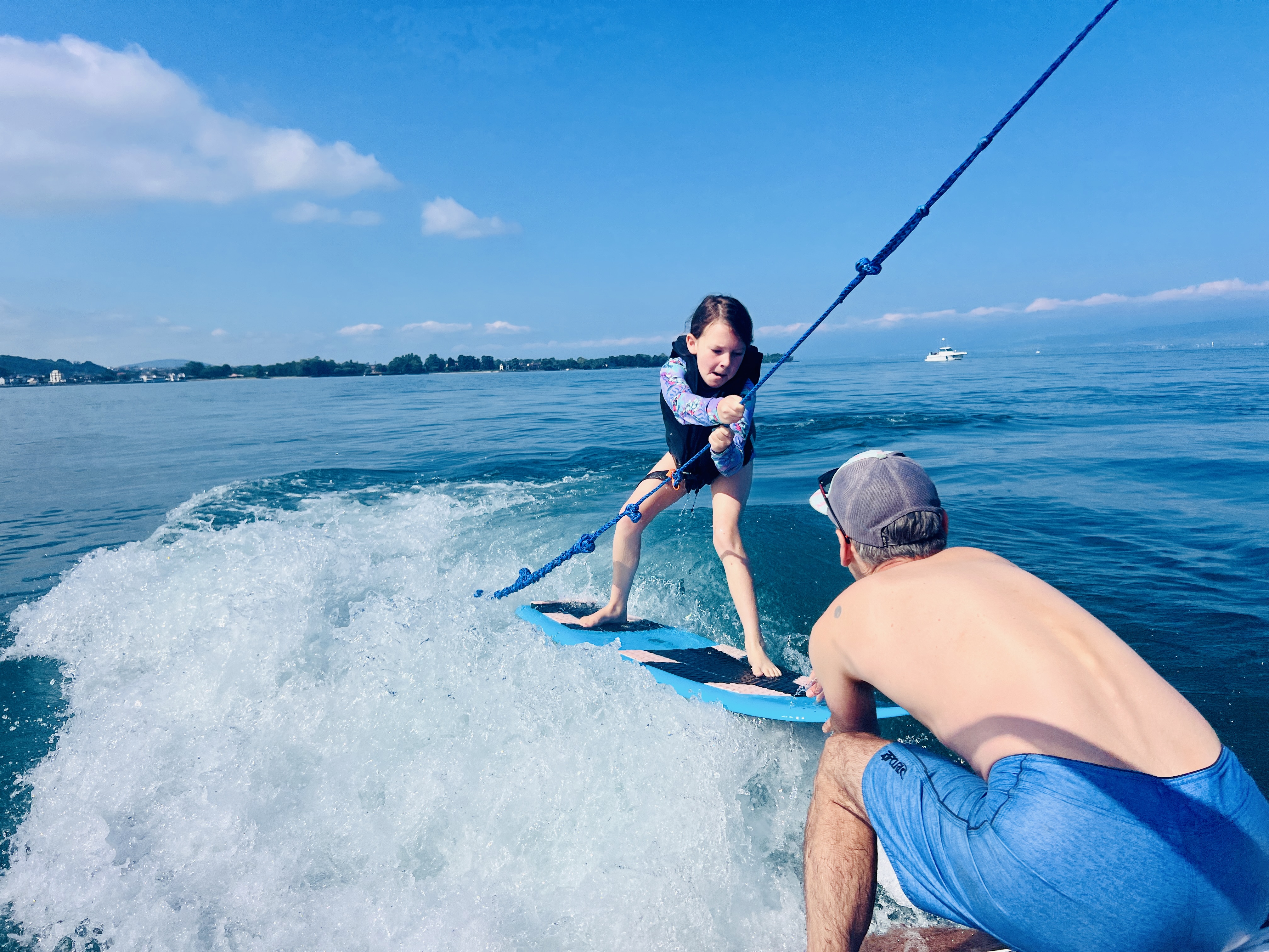 Despite the drizzly conditions, we were on their boat and on the lake within a couple of hours, and learning how to wake surf, with highly variable success. Once it did click, however, it was super fun.
