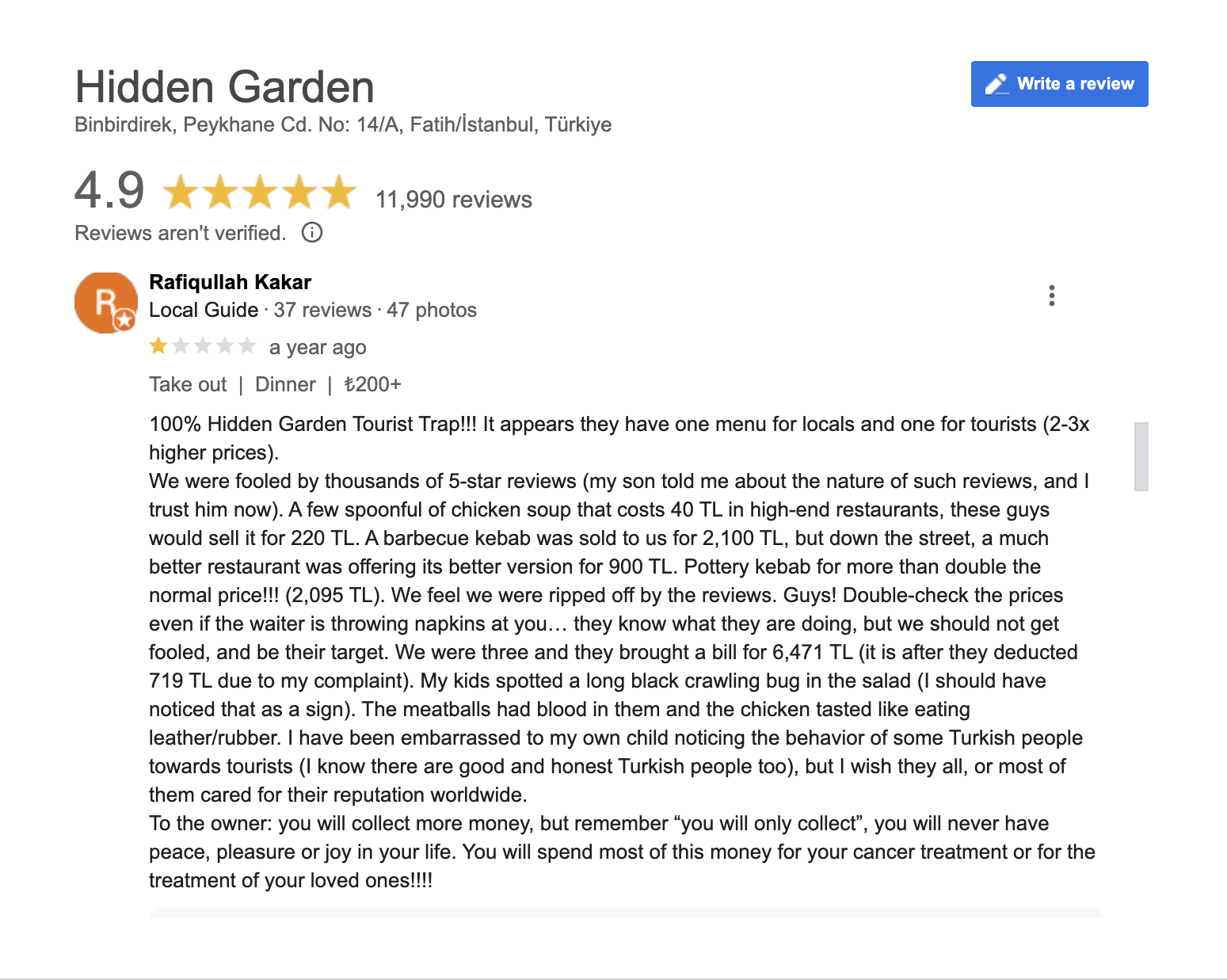 Fun fact about Istanbul – they broke Google reviews. Most restaurants have thousands of reviews, most of which are 5 star (and automatically generated). Occasionally you have poor reviews too, which are responded to in a long winded and highly emotional manner. The net result is that Google reviews – normally a mainstay for us (if not Liz’s only source) – were not helpful.
