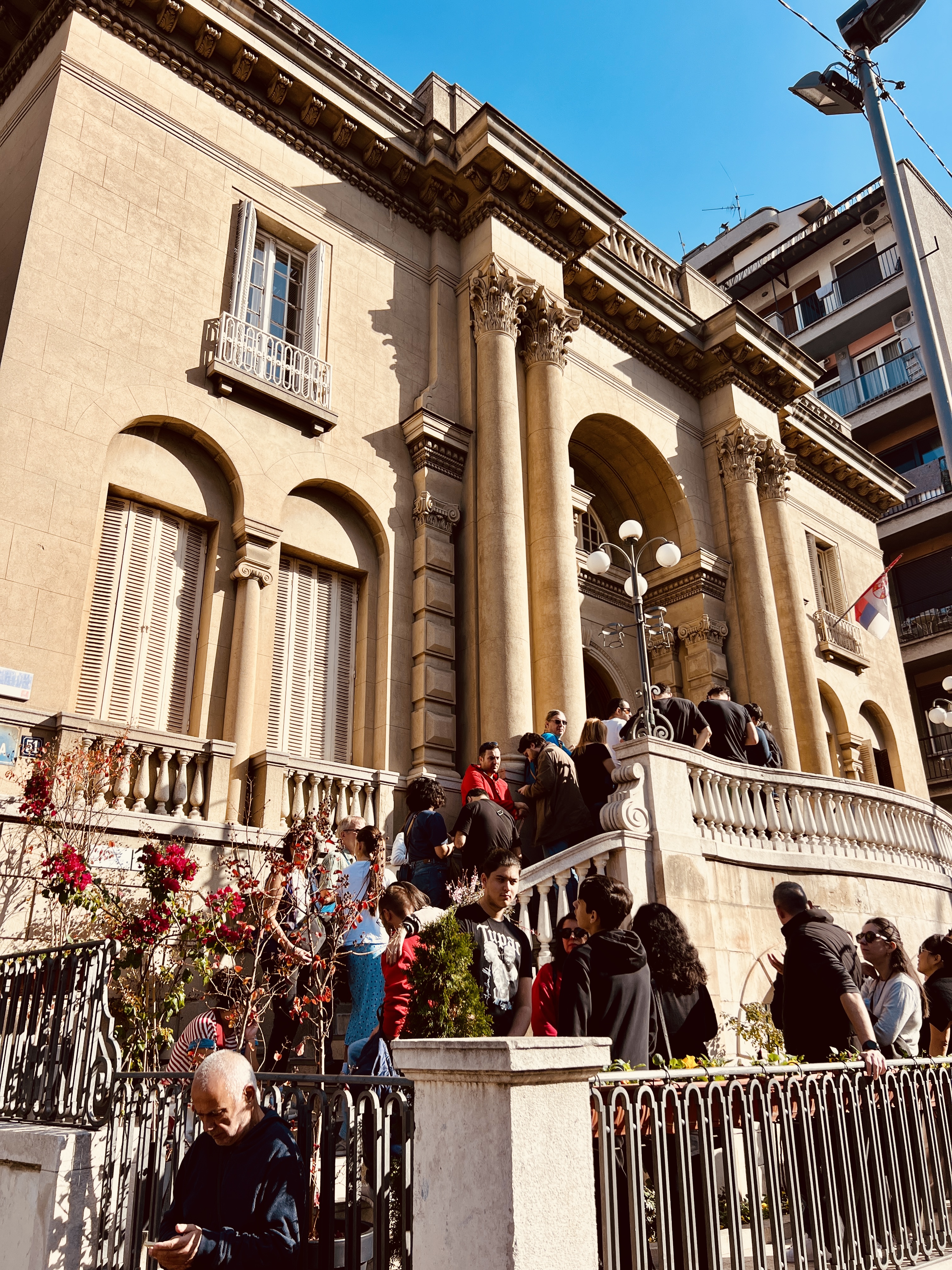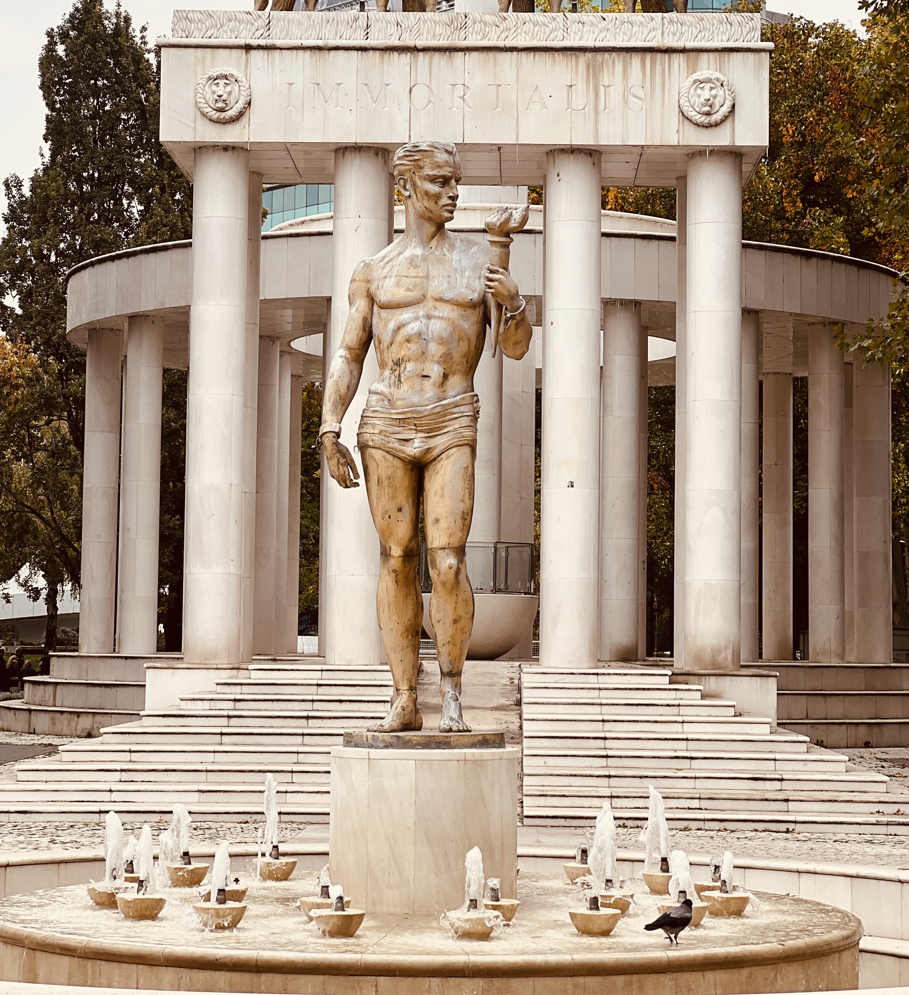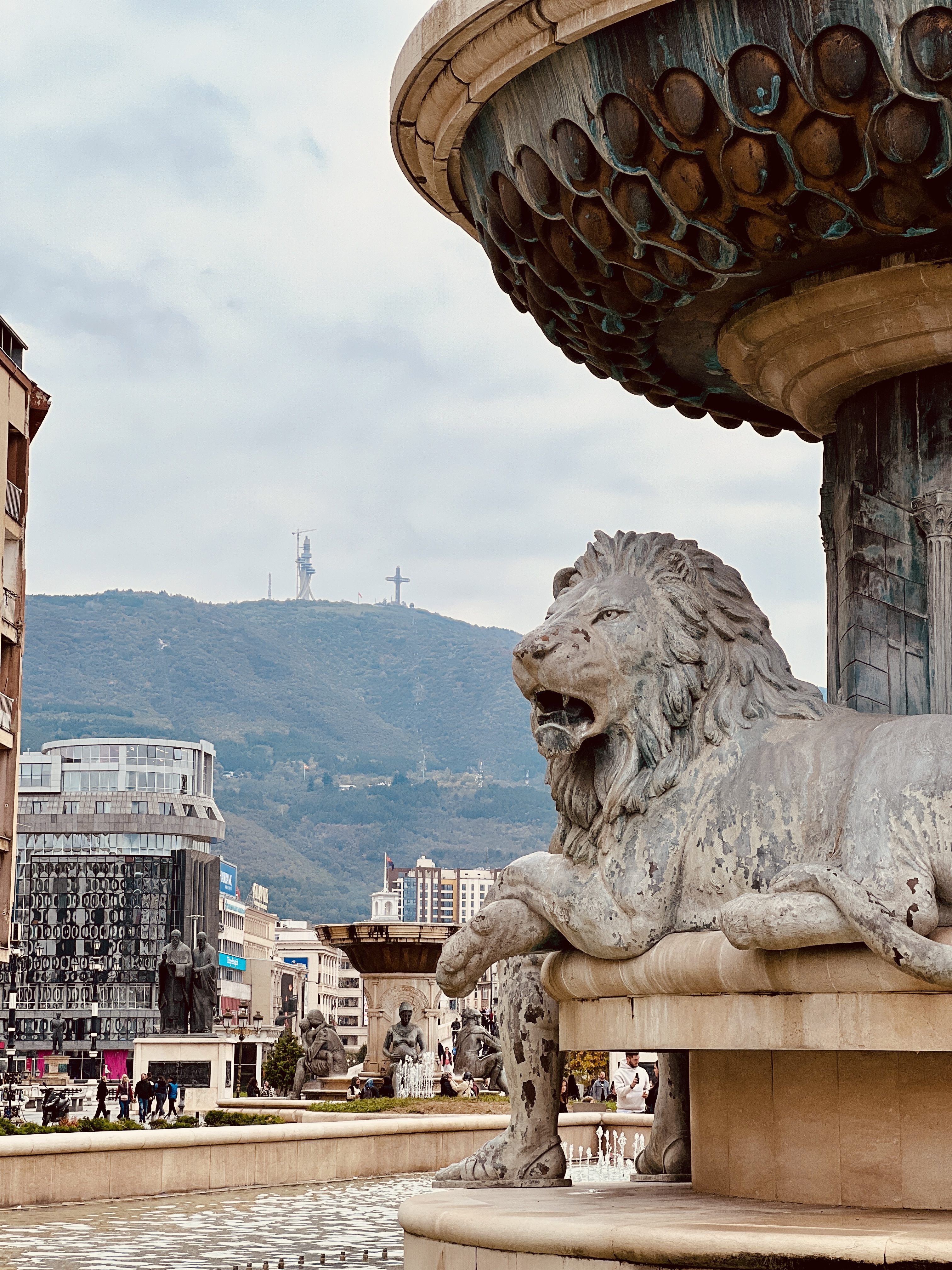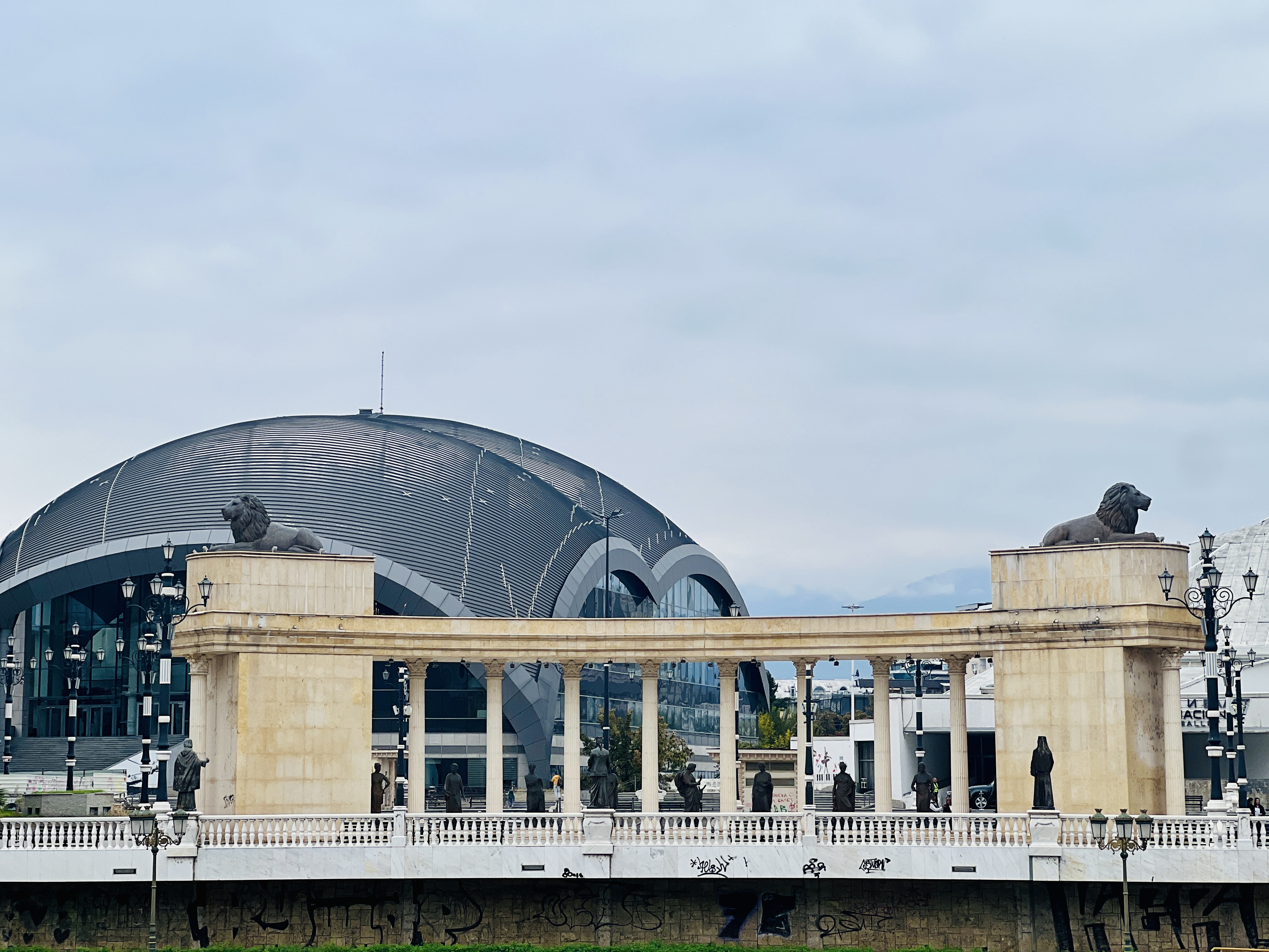 We were immediately struck by the architecture of the center of the city. Gone were the ramshackle streets that we had come through on the bus, replaced now with wide, generally pedestrianised boulevards, lined with stately buildings often adorned with Doric columns. Oversized triumphal statues lined the streets; the main square was dominated by an enormous, mounted Alexander the Great encircled by lion fountains. As we made our way down to the river, we were met with even more triumphal buildings, multiple picturesque bridges lined with yet more statues (think Charles Bridge in Prague), more columns, and several large wooden ships moored against the river bank. The old Stari Bridge looked almost out of place for its stone ‘plain-ness’