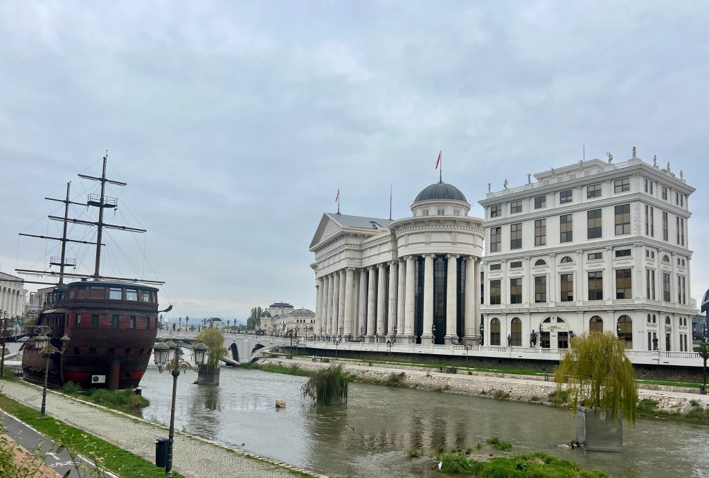 That was before he started on the multiple cheap pedestrian bridges over the knee deep river Varder, interspersed with several wooden pirate ships (note: North Macedonia is a land locked nation with no naval history, let alone pirates) which covered the view to the only ‘original’ thing in the whole town centre – the old stone bridge.