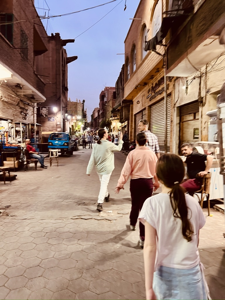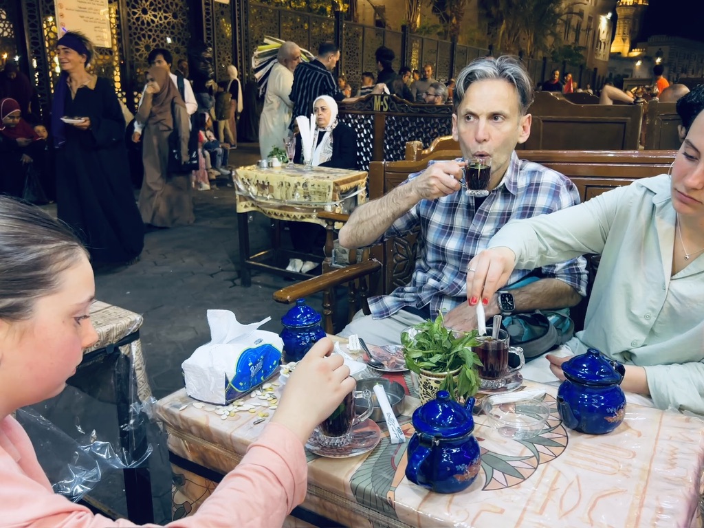 We continued our walk down the bustling narrow streets and alleyways of Old Cairo, navigating around the honking horns of speeding motorbikes and vendors selling their wares. We made our way into the Khan el Khalili market and had a cup of tea, all the time being relentlessly hassled by vendors and beggars. The kids shrunk further into our arms.
