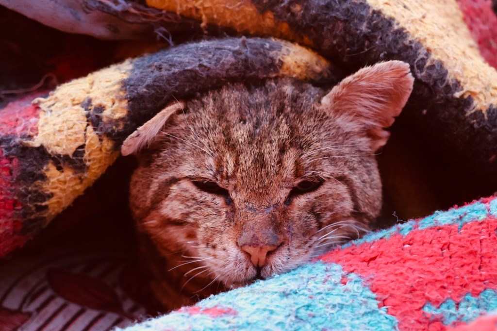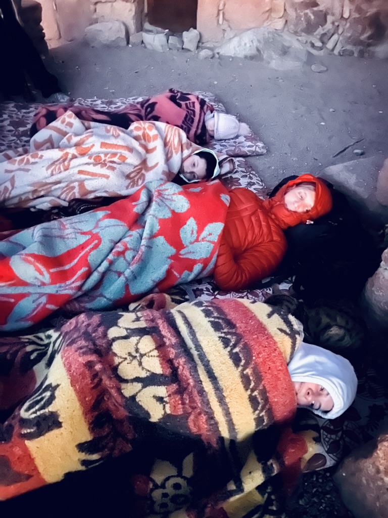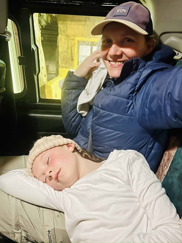 We all curled up together for warmth. Ellie was quickly joined by a local cat who we named Larry, who snuggled into her blanket and expressed his overall approval of the situation with the deepest, loudest purring we’ve ever heard. He would stay with us for the entire time, only leaving when we did after sunrise.