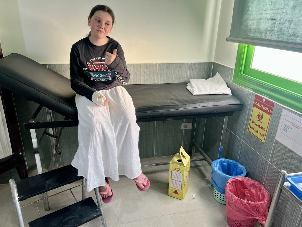 A couple of bounces too many sent us off to a local doctor and x-rays at the conveniently located and very efficient Dahab hospital (the third time we’ve had Jessie’s bones x-rayed whilst on holidays). Within 30 mins we had confirmation that there was no break (that’s 1:3 in terms of the ratio of holiday x-rays to broken bones for Jessie), her hand was strapped and we were heading back to the hotel. Pretty amazing service for 70 euros.