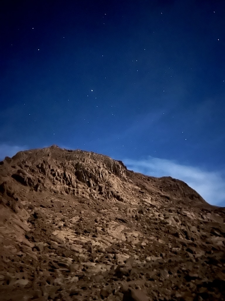Ant and Sena came off the pace, going at Sena speed instead of trying to keep pace with Moses. We found our pace and hit our rhythm, slowly but steadily making our way up the rocky path under the brightly lit moon and the glow of our head torches. Before we knew it we were at the first ‘cafe’ and back with the group. The circling Bedouins and their camels looked surprised and a little upset with her progress.