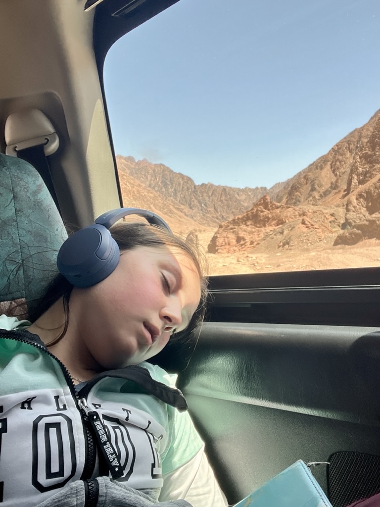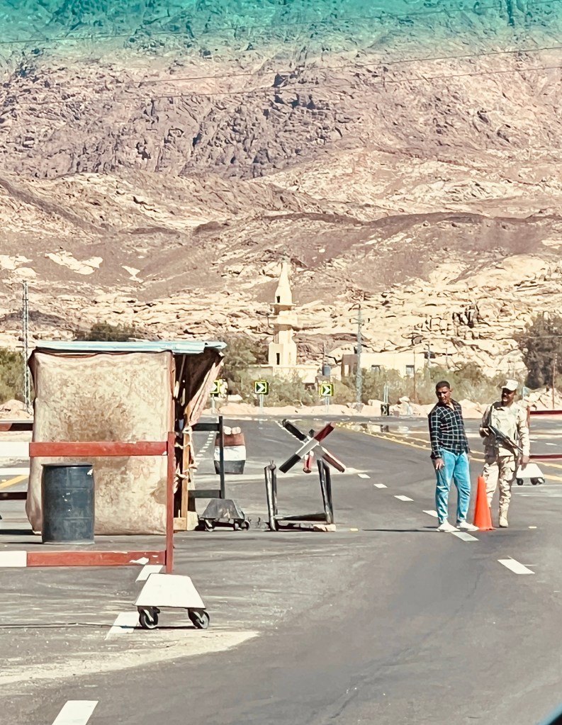 The northern half of Sinai (from Suez to Nuweibaa, just north of Dahab) is off limits to tourists including those from UK and Australia. Our driver was planning to take that route but ultimately acquiesced to take the more southerly route via Saint Catherine (next to Mount Sinai). For the next 4 hours we watched the Sinai desert roll past the windows as we made our way south and east through a combination of flat valleys and rolling mountains and a heap of checkpoints. The kids went from perturbed by the guards and the guns, to accepting. It’s all part of the adventure, and in fact it was a lovely way to pass the day, despite the excitement of Egyptian driving (both ours and others on the road!)