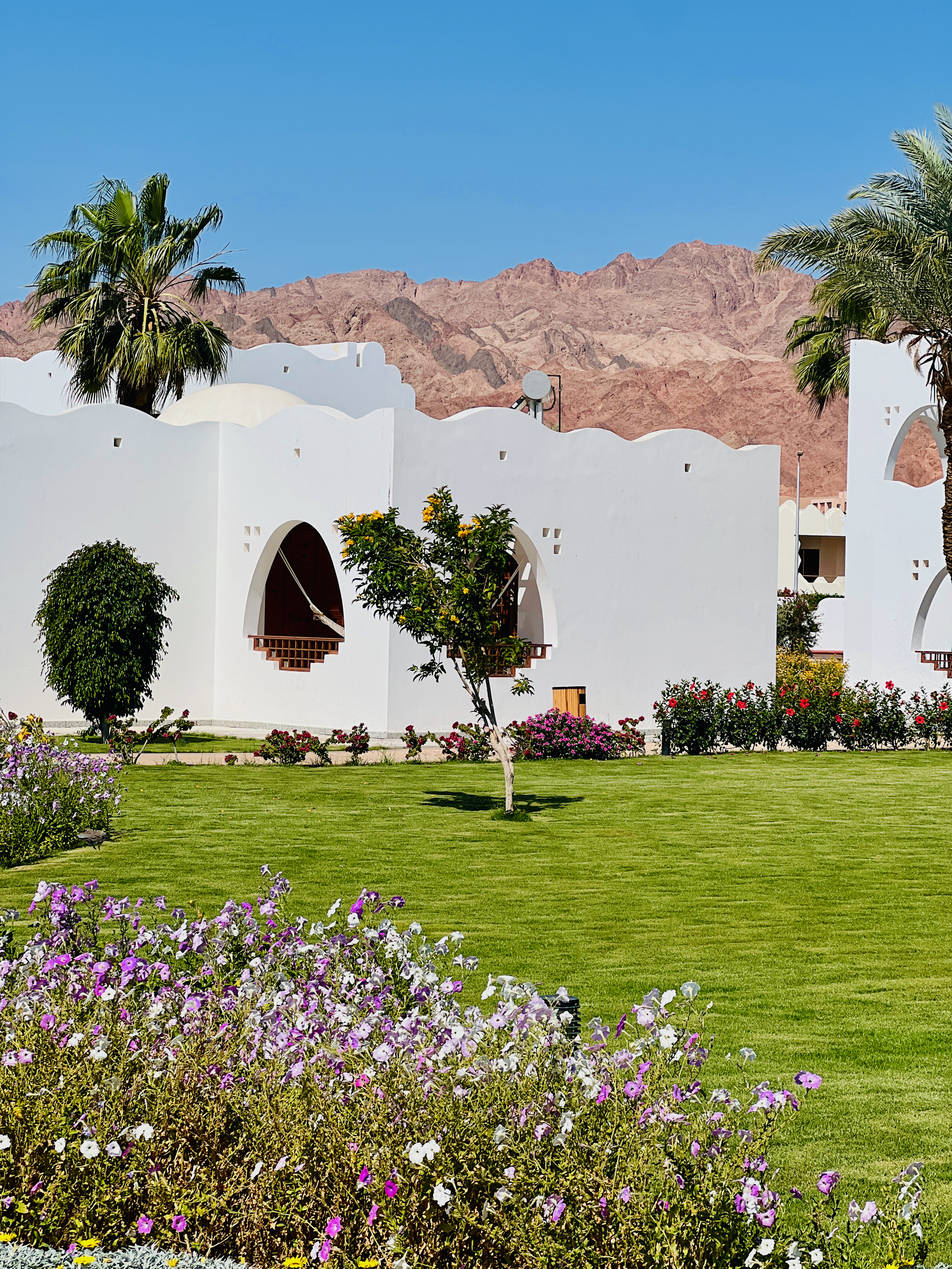 We pulled into the beautiful Safir resort (yes OK, we’re still trying to take the kids to backpacker type locations, but we’re more than happy to stay at nicer places when we do it!). The resort comprised a series of white domed apartments, with beautifully tended gardens overlooking a central pool, palm trees and the blue water and red mountains of the Sinai in the background. Absolutely stunning. Yes, we were spoiling the kids.