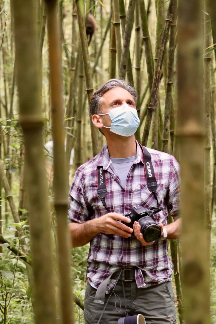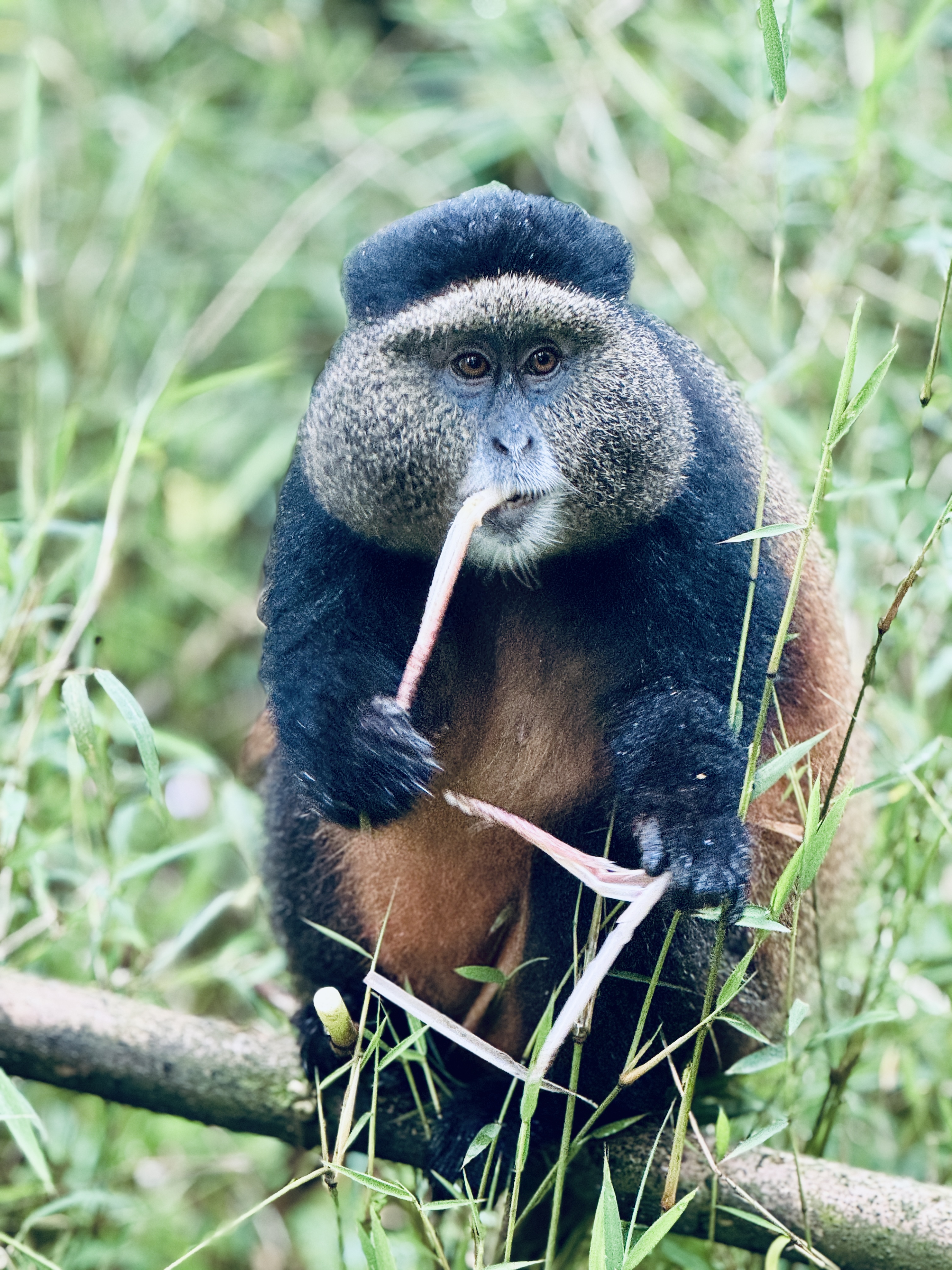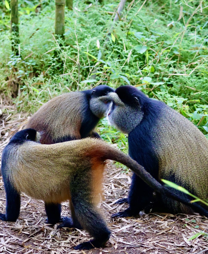 We crossed a rickety bridge into the National Park and within minutes were surrounded by dozens of golden monkeys, going about their day munching on bamboo shoots, unperturbed by the swarm of aging western tourists (present company excluded of course) with expensive cameras invading their habitat. They were clearly used to the sound of tourists tramping and shutters clicking, and they basically ignore us as well ogled and scrambled for the perfect shot.