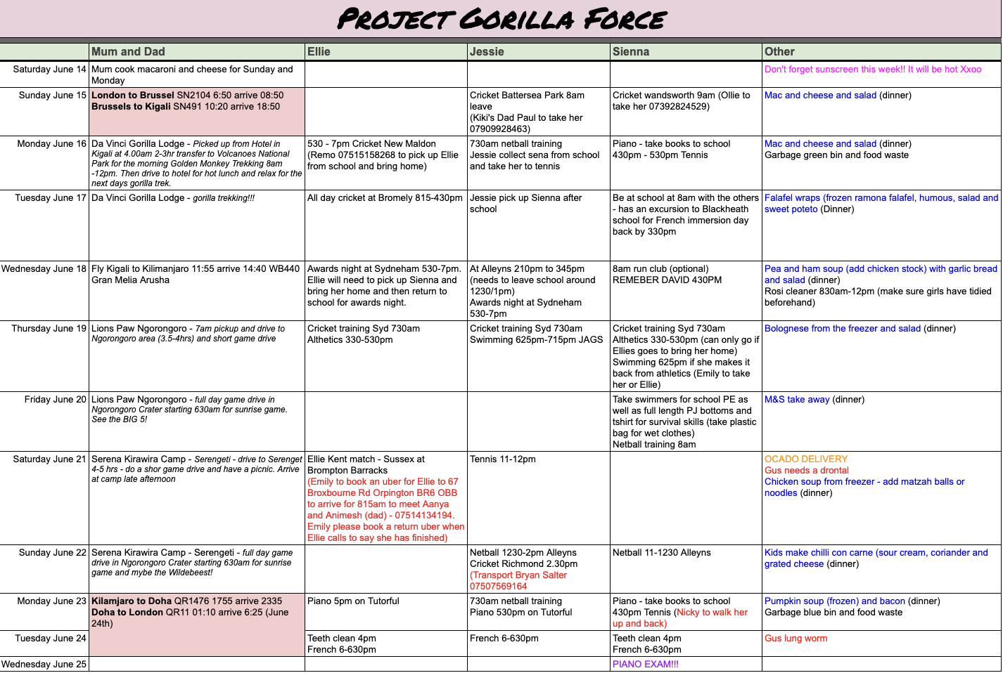 Emily, our resident dog walker and sitter, and Gus’s favourite person in the universe was there to broaden her role, supported by a very detailed spreadsheet.
