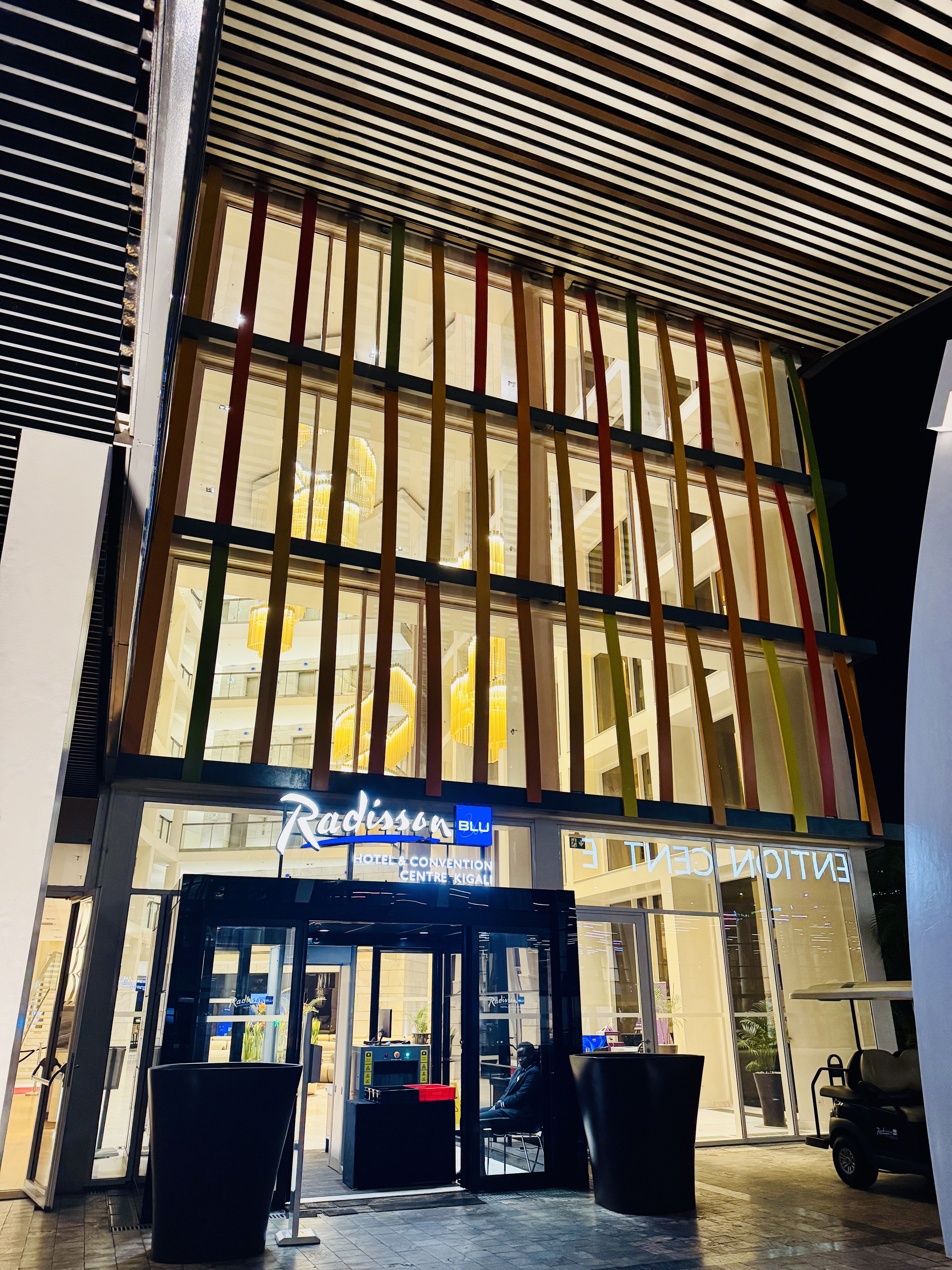 A short way from the airport was the shiny Radisson Blue hotel next to the equally shiny Convention Centre, lit up in Rwanda’s colours of blue, green and yellow. This area was obviously developed to project a city ‘on the move’.