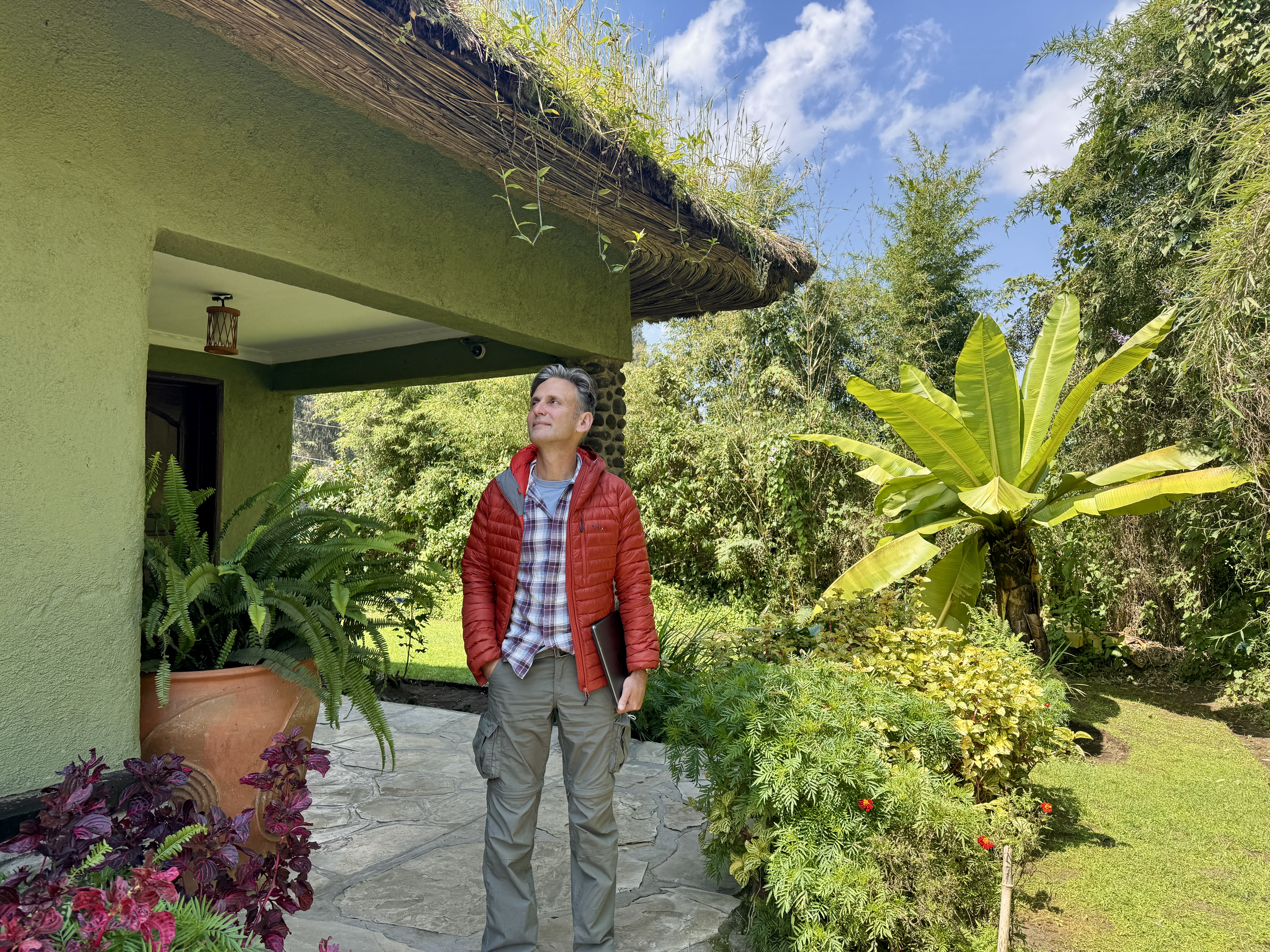 Back to the check in station and our fresh coffee… before long another 30 or so tourists arrived and the queue for the coffee line grew. We sat and watched the demographic, Ant sipping his excellent cappuccino. The visitors were almost all ‘mature’ – mostly 40+, decked out in expensive Gortex and without children (you have to be 15+ to trek with the gorillas). Surprisingly North American accents dominated with very few Europeans.