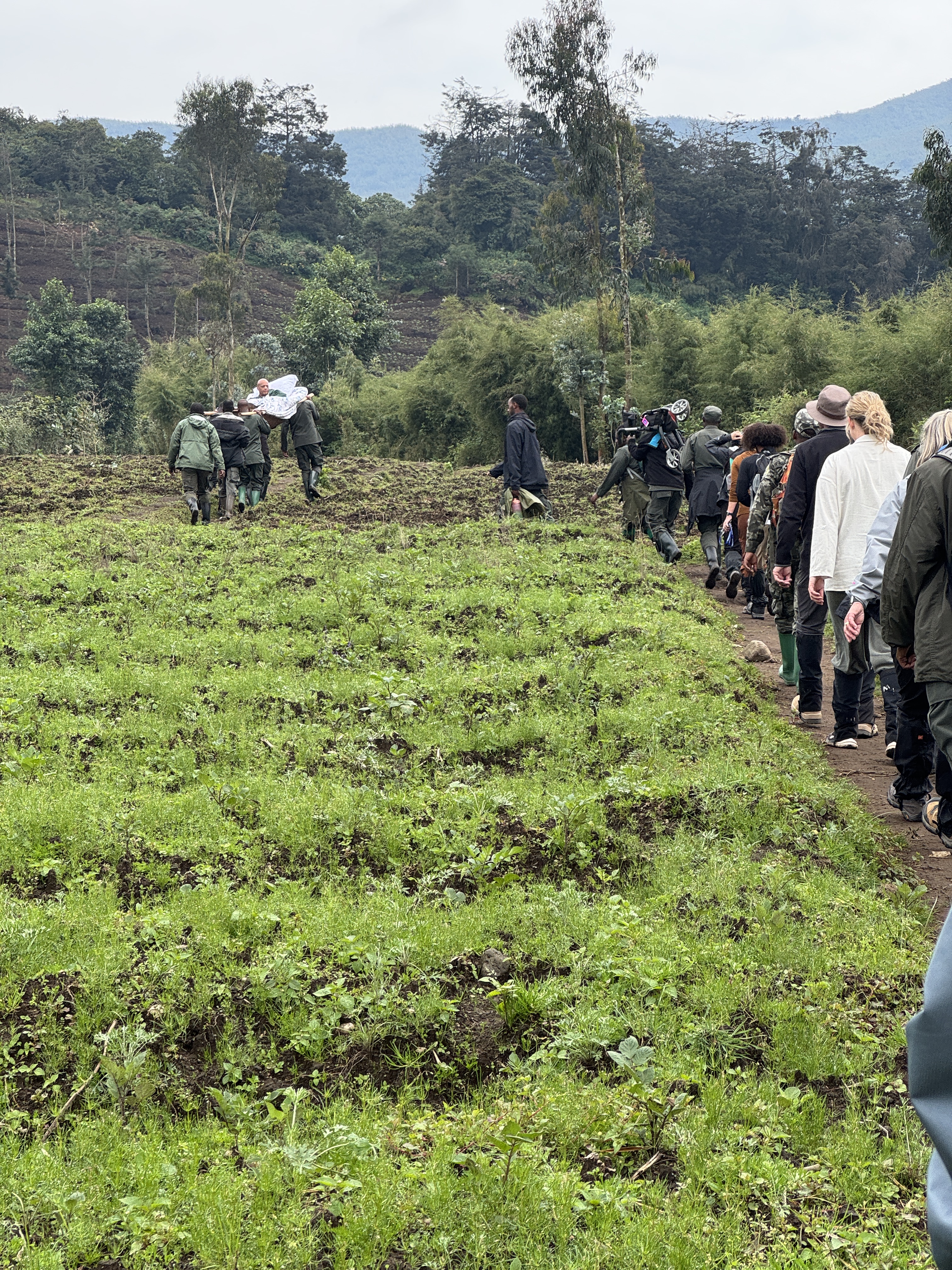 Side note here: trekking with Gorillas is, as the name suggests, not a passive activity. The treks range from ‘easy’ – perhaps 90 mins through farmland and forest, up moderate inclines; to ‘hard’ which can be 5+ hours cutting trail up steep volcanic slopes to 4000m+. Either way you have to walk. We saw a guy at the reception who was walking with the aid of a ‘zimmer frame’ and wondered how that would work. No problem – a team of 4 porters put him in a stretcher and carried him up. All for $150 (they totally should have charged 10x for that, especially considering the cost of the permits – $1300). Amazing from a customer service and an accessibility point of view, and seemingly typical of this region – people power will overcome most challenges.