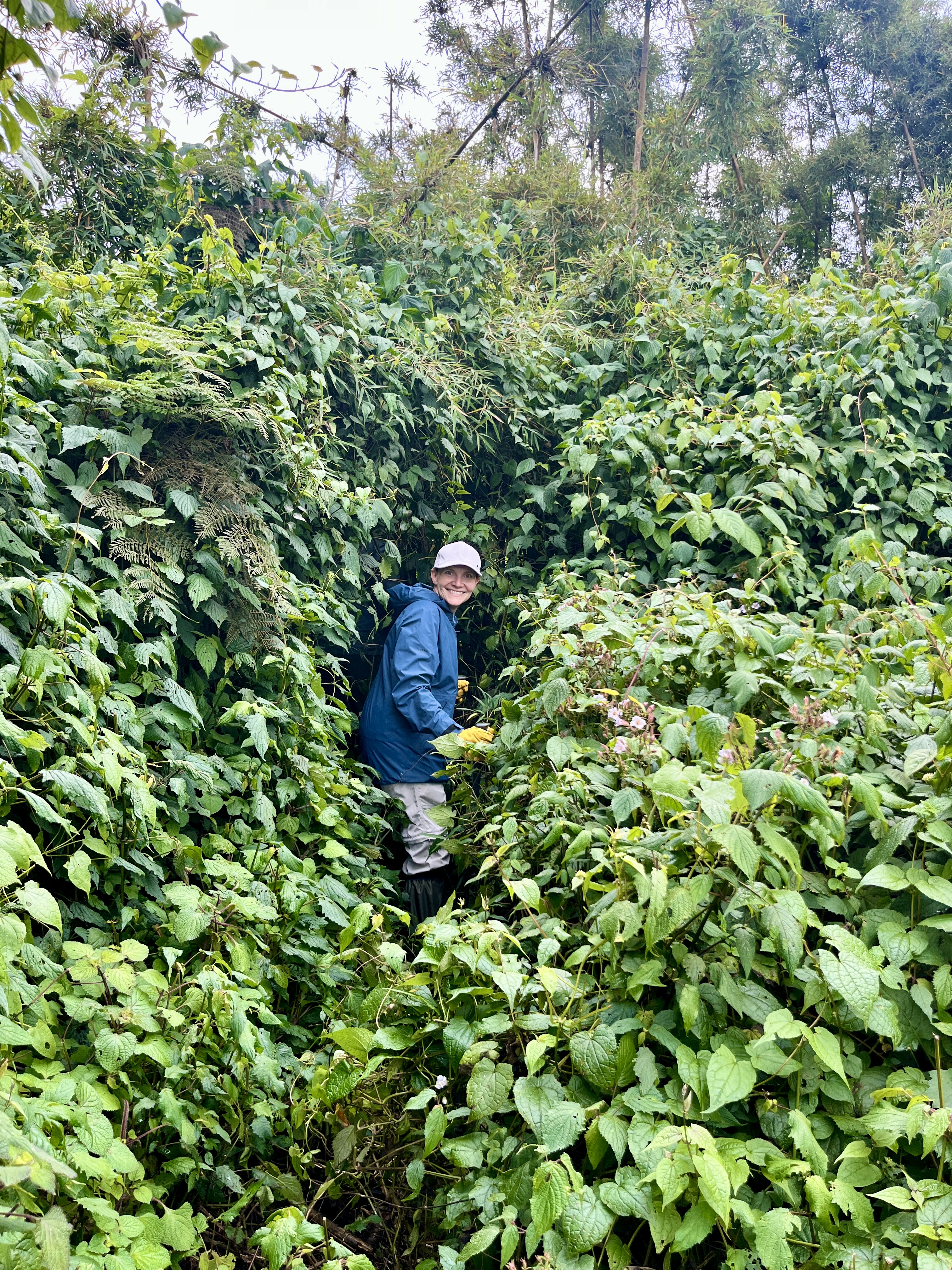 Back to our hike now – we made our way through the farmland, passed the guard with his machine gun and into the national park. We were joined by a group of porters, some trail breakers (armed with machetes to cut through the undergrowth) and we would be joined by a group of trackers who were currently locating the family (NB: the gorillas can move up to 2 kms per day and tend to nest in a different location each night, so every morning the trackers have to go ahead and find the groups). So many people to support our group of 8.