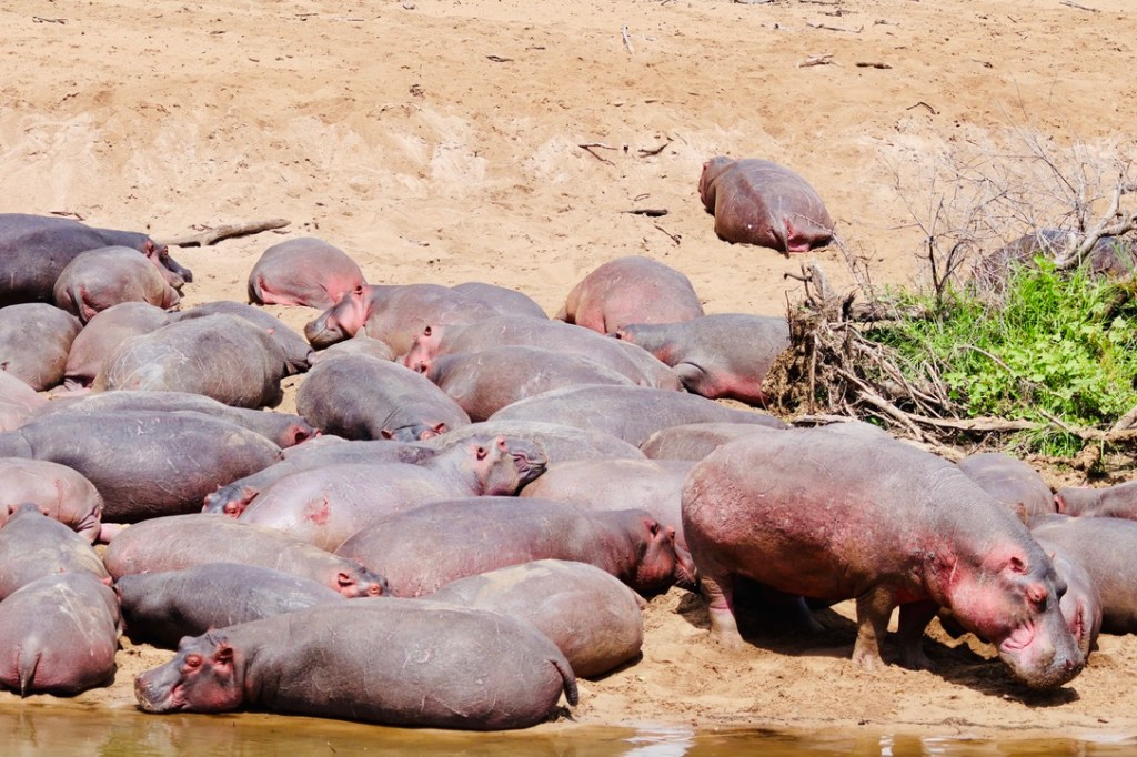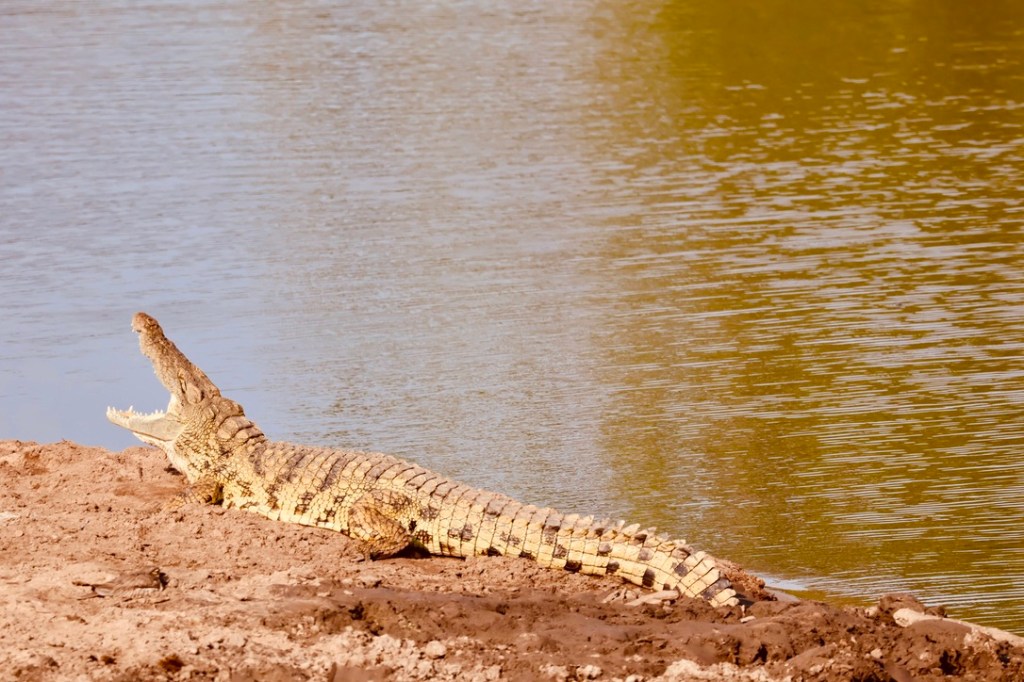 Instead we were greeted with 73 hippos (yes, we counted) sunning themselves on the banks of the river, alongside a couple of smaller crocodiles.