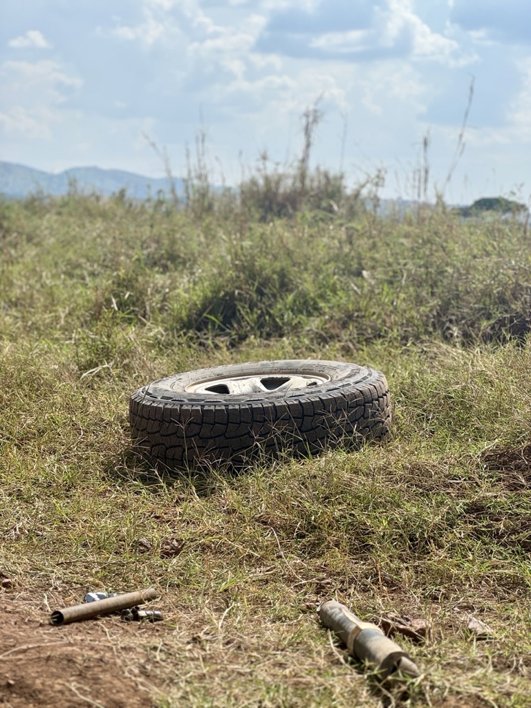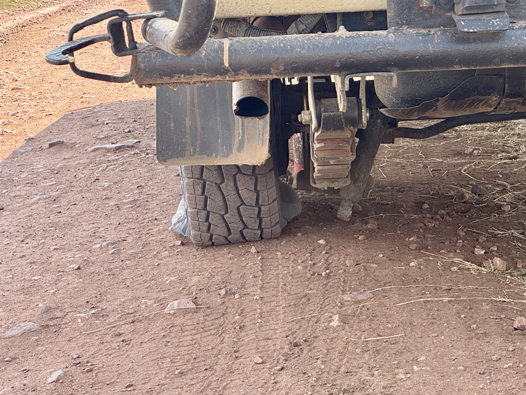 Some 5kms from the air strip and inevitably, Malles tried to bounce over one rock too many. We heard a pop and then a hissing sound that we knew too well. That would be the second flat – this time on the front left.