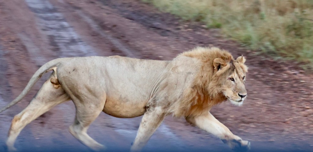 We looked to our right and saw 2 male lions closely following the procession with hungry interest.