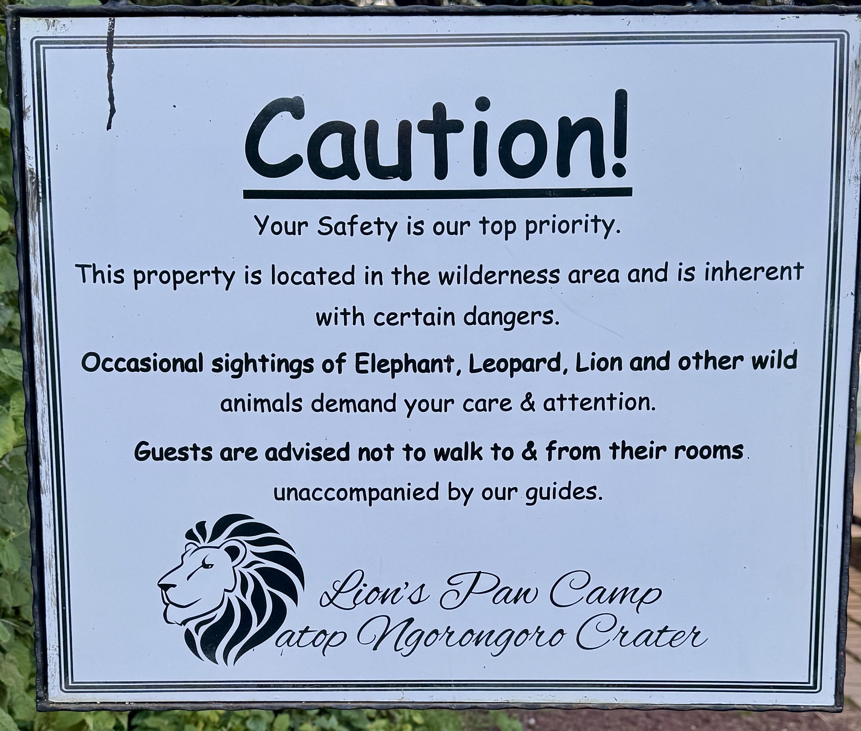 At the end of the day we made our way back up to the rim and to the lovely ‘Lions Paw’ camp, which was set in scrub land overlooking the crater. A sign welcomed us saying that lions, elephants and other animals frequented the property and guests needed to be accompanied to their huts after dark.