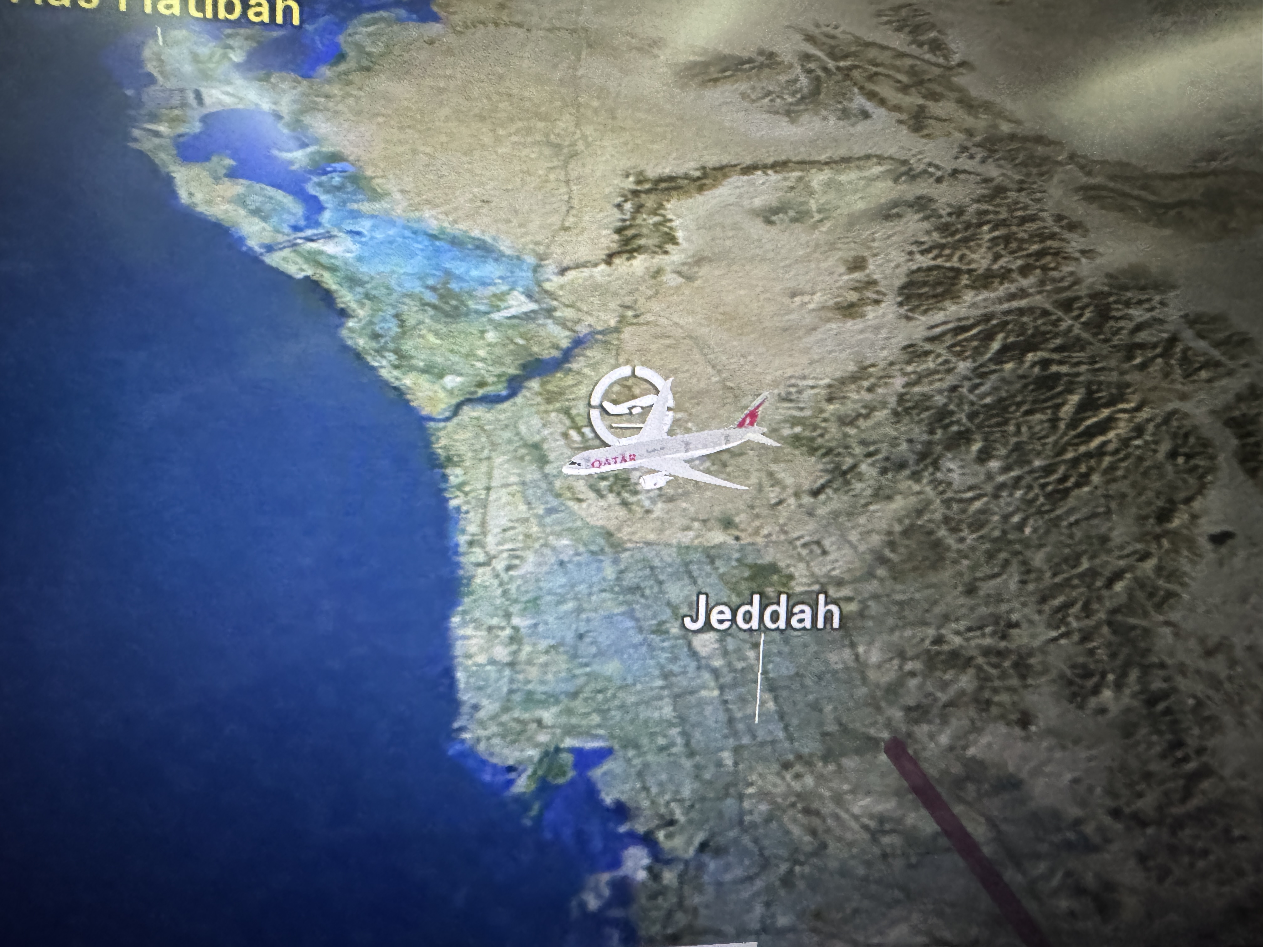 Suddenly the cabin lights were turned up to full and we were awakened from our movies or naps to the sound of the Captain’s voice – Qatari airspace was shut and we would be landing in Jeddah, Saudi instead.