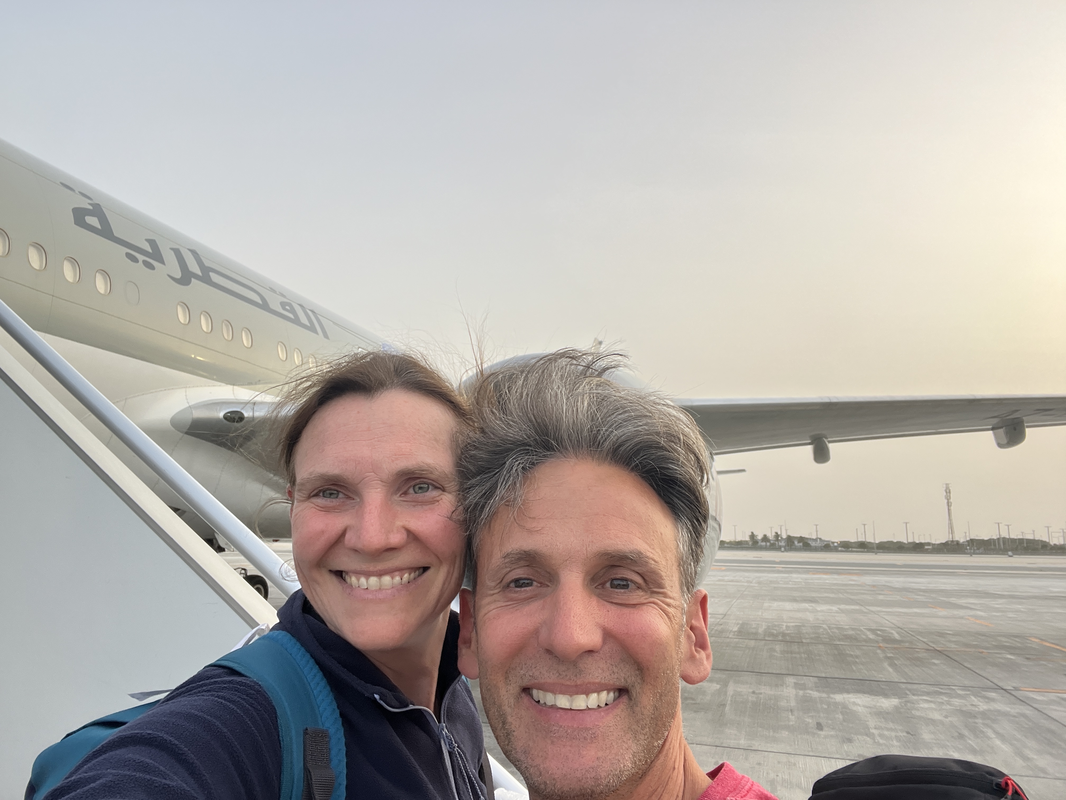 Our 787 Dreamliner made it’s way north over Uganda and into the Sudan, cutting it’s way briskly through the clear evening sky. We were making good time – planning to arrive in Doha 30 minutes early which would ease our planned rapid transfer. Liz had just enjoyed ‘the best meal ever on a plane’ before settling in for a movie and maybe a quick nap. Things were looking good.