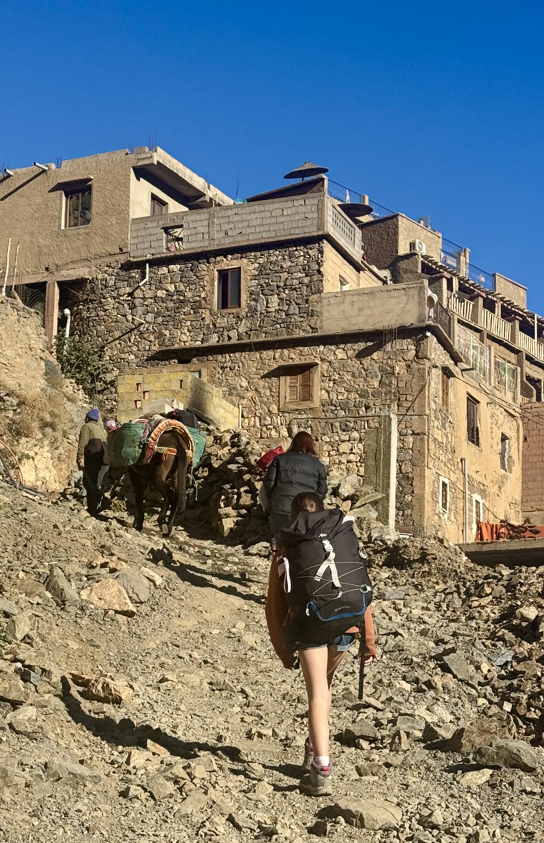 We went up through 3 of the villages that are scattered in the Imlil Valley, climbing up to 2,500 meters and being rewarded with stunning views over the valley and the Kasbah. This area was the epicentre of the 2023 earthquakes which killed some 3000 people – as we passed through the villages we could see a bunch of residual damage and slow moving construction projects that were still in progress 2+ years later.